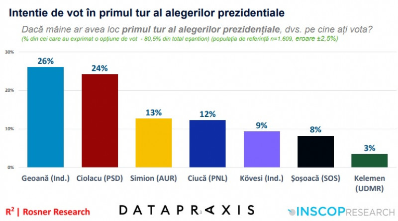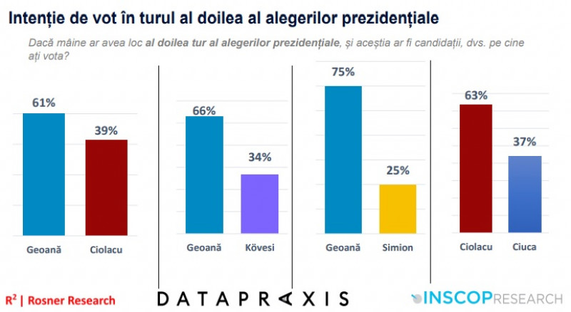 În ceea ce privește intenția de vot la primul tur al alegerilor prezidențiale, Mircea Geoană ar obține cel mai bun rezultat din postura de candidat independent. Acesta ar intra în turul doi cu candidatul PSD, Marcel Ciolacu.