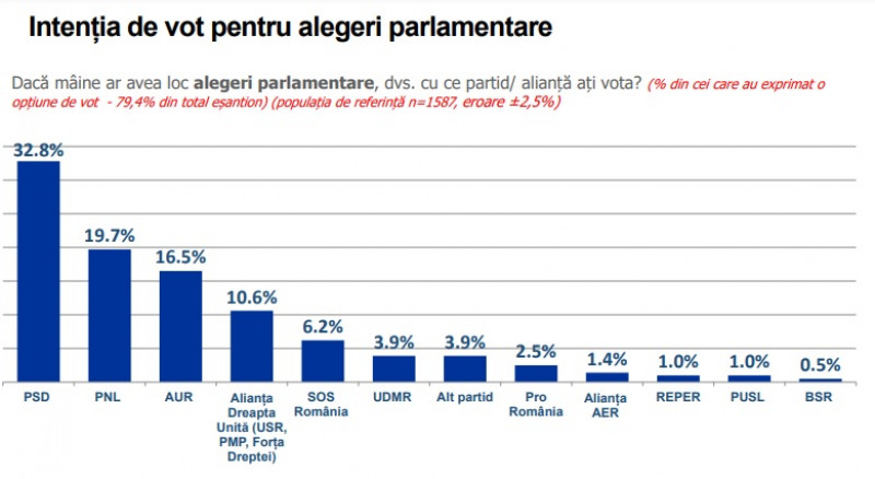 În privința alegerilor parlamentare, PSD conduce în intenția de vot, urmat de PNL și AUR.