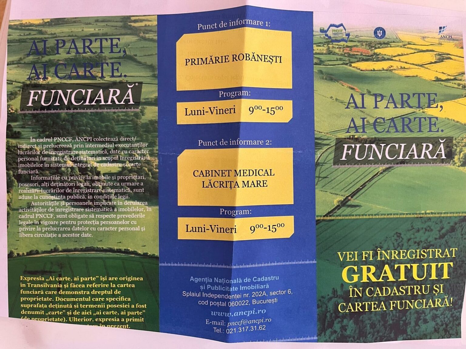 Reprezentanții Oficiului de Cadastru și Publicitate Imobiliară (OCPI) Dolj, s-au întâlnit, joi, cu cetățenii comunei Robănești într-o campanie de informare cu ocazia începerii lucrărilor de cadastru general. Înregistrarea proprietăților din comuna Robănești în sistemul integrat de cadastru și carte funciară vizează o suprafață de 4.195 de hectare și este gratuită pentru cetățeni.