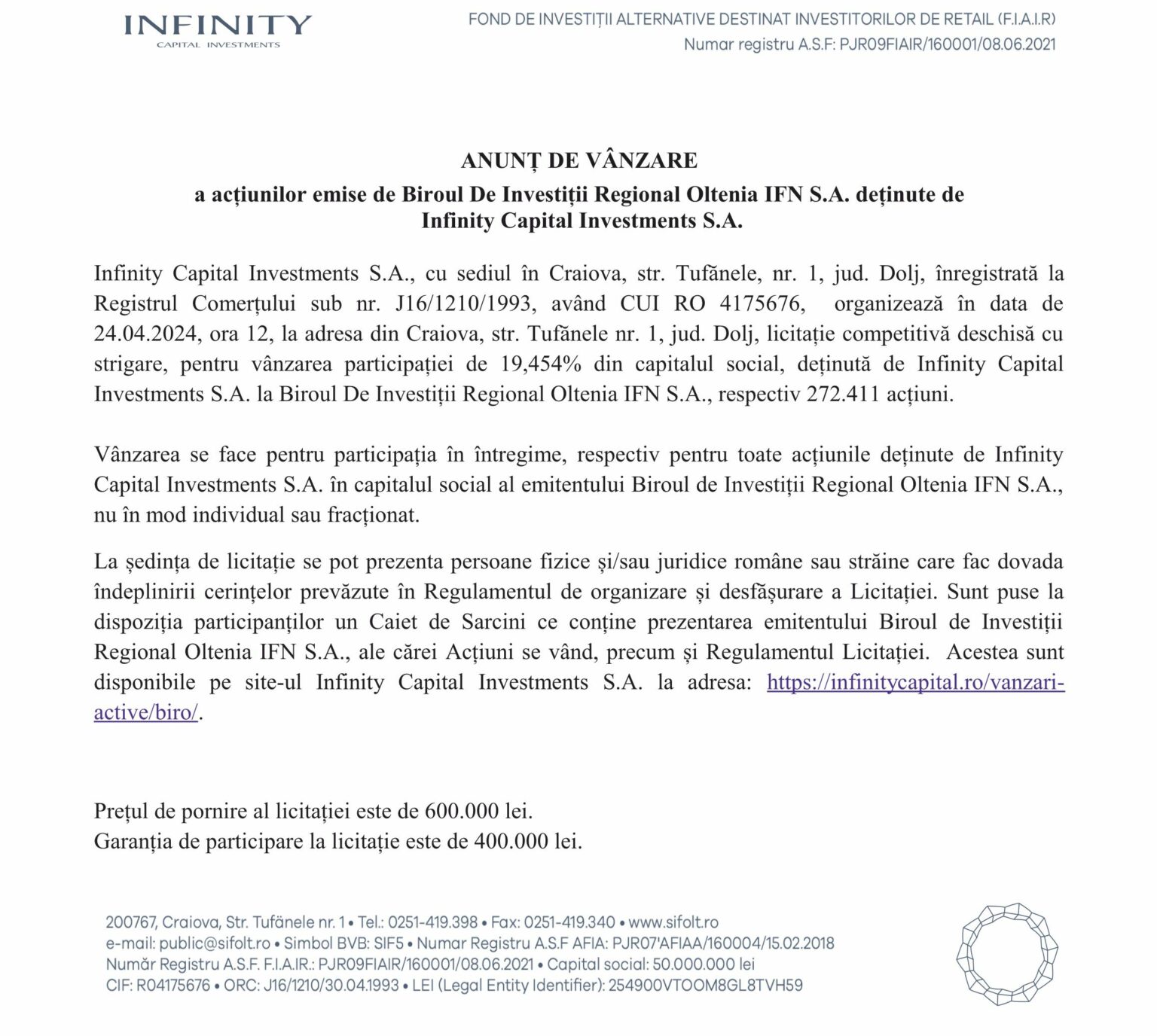 ANUNȚ DE VÂNZARE a acțiunilor emise de Biroul De Investiții Regional Oltenia IFN S.A. deținute de Infinity Capital Investments S.A.