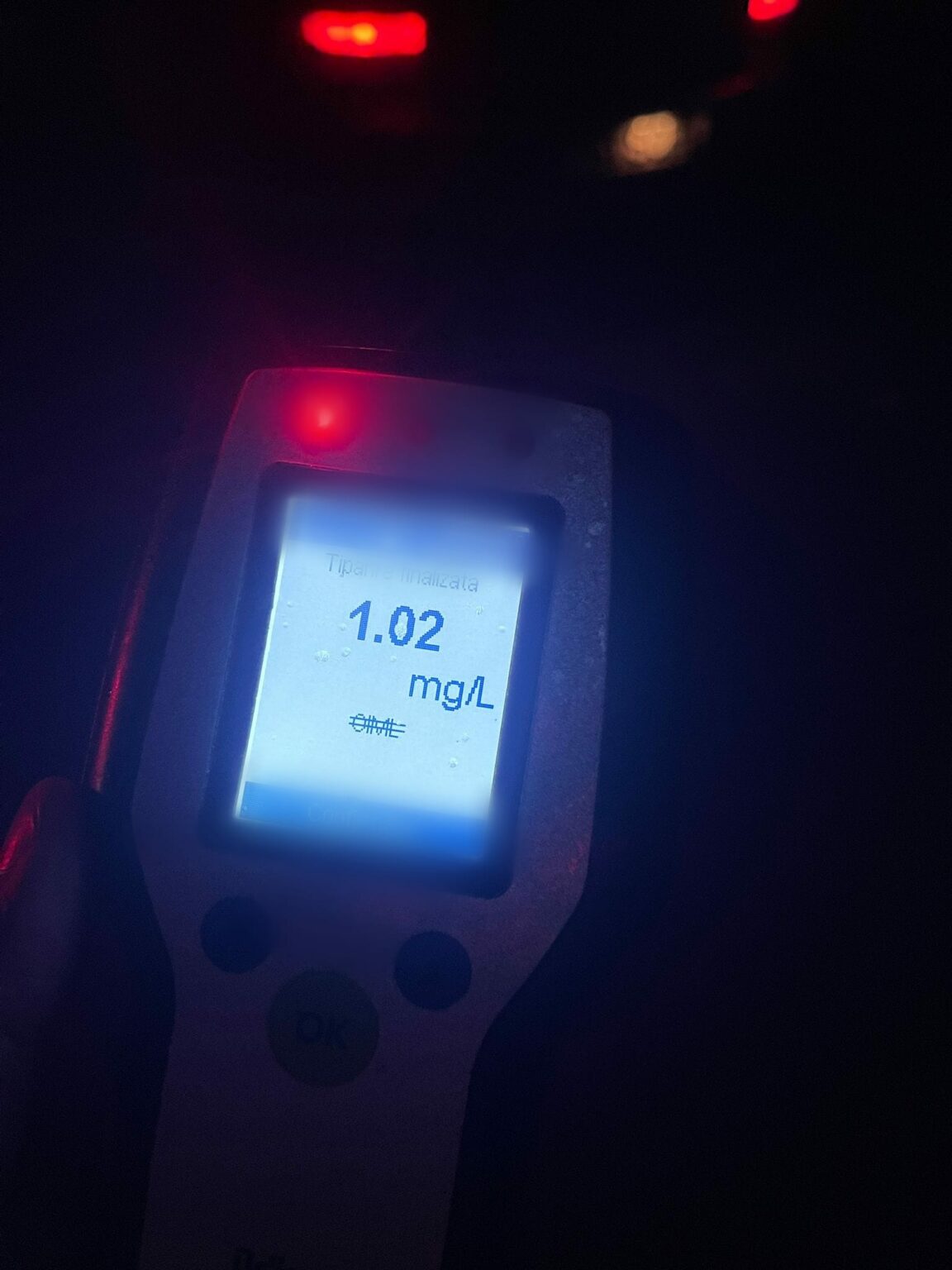 Bărbatul a fost testat cu aparatul etilotest, rezultatul fiind de 1,02 mg/l alcool pur în aerul expirat.