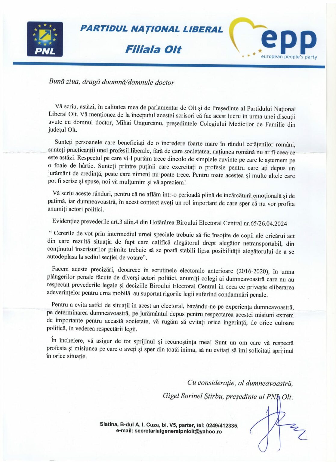 Medicii de familie din județul Olt s-au trezit zilele trecute, pe adresele de e-mail de la cabinete, cu o scrisoare semnată de președintele PNL Olt, Gigel Știrbu, în care acesta îi atenționează că se pot alege cu dosare penale.