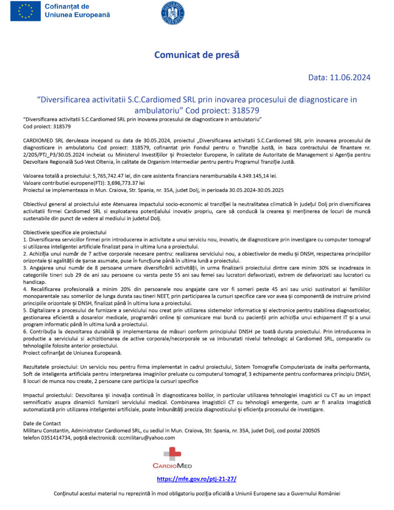 AnunturiComunicat de presă – “Diversificarea activitatii S.C.Cardiomed SRL prin inovarea procesului de diagnosticare in ambulatoriu” Cod proiect: 318579 Jurnalul Olteniei 11 iunie 2024 Share SHARE Jurnalul Olteniei See Full Bio Distribuie acest articol Facebook Whatsapp Whatsapp Email Copy Link Print Articolul precedent Vlad Popescu, elevul din Vâlcea inclus în lotul extins al României pentru Campionatul European de Securitate Cibernetică Articolul următor Copil de 15 ani, lovit de o mașină pe trecerea de pietoni Ultima ora Scandal în Gorj: Doi tineri reținuți după o bătaie 6 decembrie 2025 Sfântul Nicolae: 800.000 de români sărbătoriți pe 6 decembrie 6 decembrie 2025 Zilele Colindului în România: Tradiția care unește țara 6 decembrie 2025 Se știe grupa în care poate juca România la Cupa Mondială din 2026 5 decembrie 2025 Dolj: Ajutoare sociale de peste 76 milioane lei 5 decembrie 2025 Cea de-a VII-a ediție a Semimaratonului Craiovei a avut loc sâmbătă, 18 octombrie 2025. 5 decembrie 2025 ANUNT PRIVIND ORGANIZAREA ACHIZITIEI DE UTILAJE . MINIEXCAVATOR – LOTUL 1, UTILAJ DE FORAT HIDRAULIC – LOTUL 2 – RELUATÃ 2 5 decembrie 2025 Modernizarea CF Filiași: Începe proiectarea 5 decembrie 2025 Testare gratuită HPV la Spitalul Județean Târgu Jiu 5 decembrie 2025 CE Oltenia raportează emisii scăzute de dioxid de carbon 5 decembrie 2025