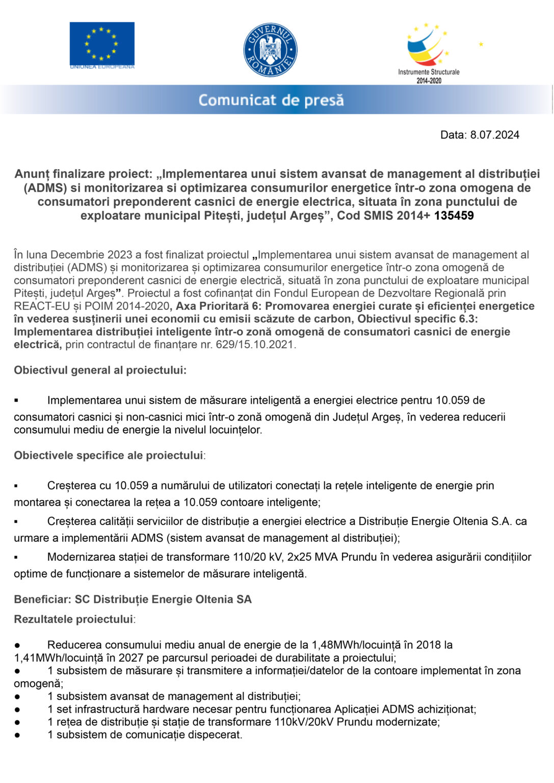 Anunț finalizare proiect: „Implementarea unui sistem avansat de management al distribuției (ADMS) si monitorizarea si optimizarea consumurilor energetice într-o zona omogena de consumatori preponderent casnici de energie electrica, situata în zona punctului de exploatare municipal Pitești, județul Argeș”, Cod SMIS 2014+ 135459