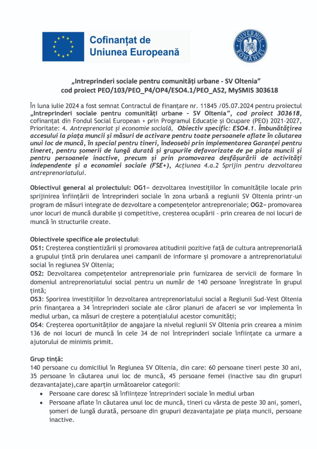 „Întreprinderi sociale pentru comunități urbane – SV Oltenia” cod proiect PEO/103/PEO_P4/OP4/ESO4.1/PEO_A52, MySMIS 303618