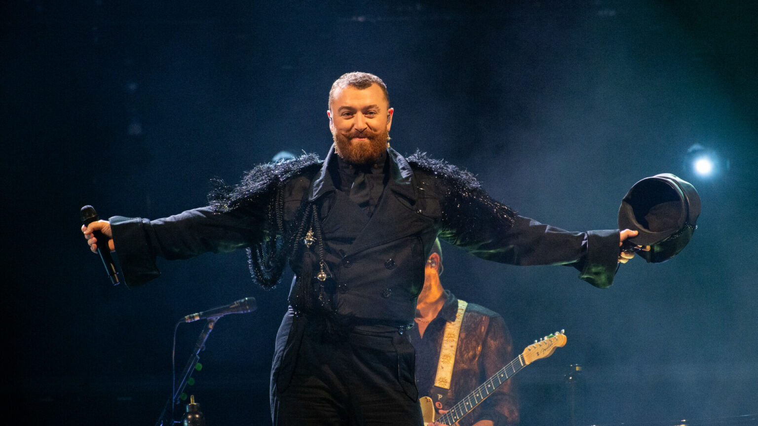 Sam Smith a schimbat mai multe rochii pe scenă, iar la un moment dat a purtat și o ținută cu steagul comunității LGBT