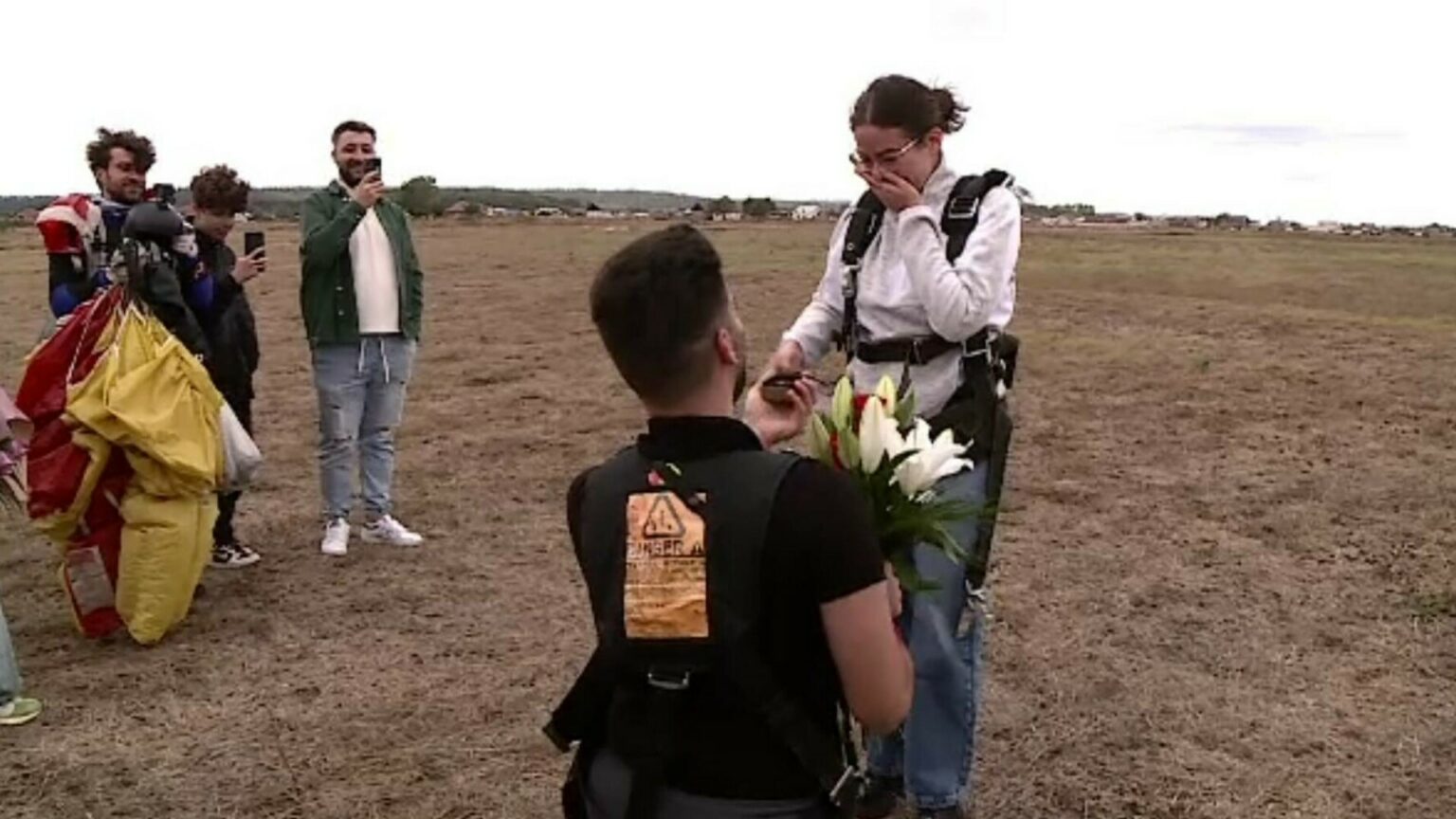 Tot mai multe persoane aleg să sară în tandem cu paraşuta, la Aeroclubul din Craiova. În acest weekend, doi tineri au avut parte de un salt special, la capătul căruia a avut loc o cerere în căsătorie. Tânăra, care încă nu își revenise după porția de adrenalină, și-a adunat forțele și sigură pe ea a spus „DA”. VIDEO AICI.
