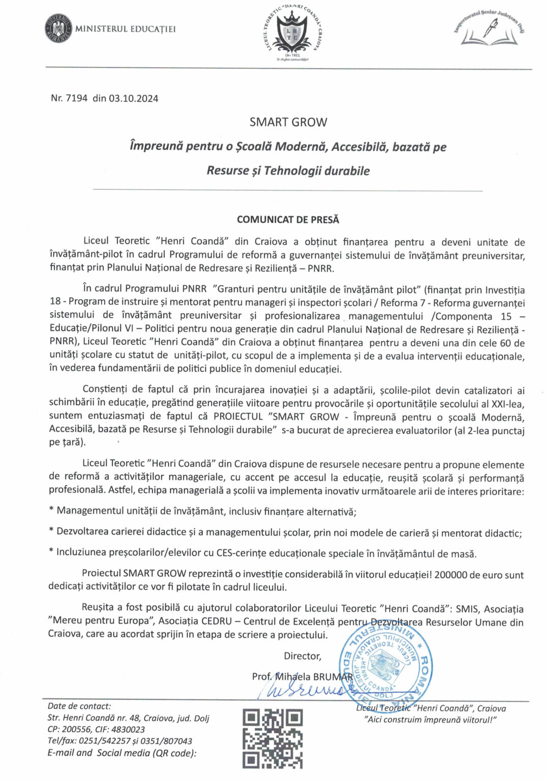 Conștienți de faptul că prin încurajarea inovației și a adaptării, școlile-pilot devin catalizatori ai schimbării în educație, pregătind generațiile viitoare pentru provocările și oportunitățile secolului al XXI-lea, suntem entuziasmați de faptul că PROIECTUL ”SMART GROW – Împreună pentru o școală Modernă, Accesibilă, bazată pe Resurse și Tehnologii durabile” s-a bucurat de aprecierea evaluatorilor (al 2-lea punctaj pe țară).