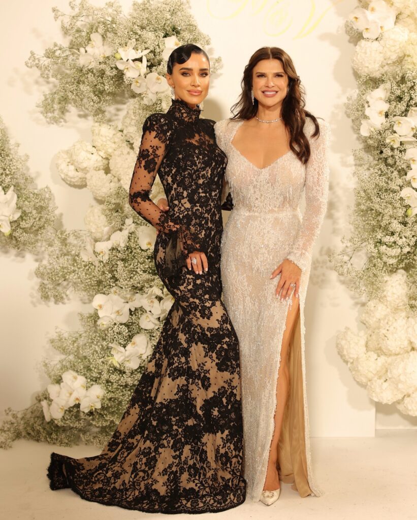 Actrița Monica Bîrlădeanu a purtat inițial o rochie tip sirenă, cu pene în partea de jos. A accesorizat-o cu bijuterii deosebite, iar părul l-a avut aranjat pe spate, fără voal, scrie libertatea.ro Pentru dansul mirilor ea s-a schimbat în a doua rochie la fel de spectaculoasă, una cu mânecă lungă și crăpătură adâncă pe picior. Ambele au fost create de casa de modă M.Marquise.