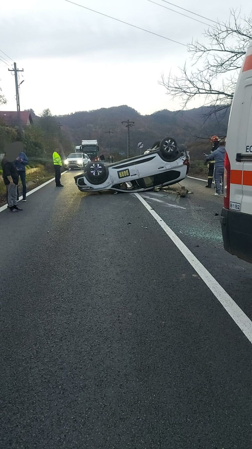 Accident pe DN 7, în Brezoi. Două mașini în care se aflau 5 oameni au intrat în coliziune. Una dintre ele s-au răsturnat, iar cealaltă a ajuns în șanț.