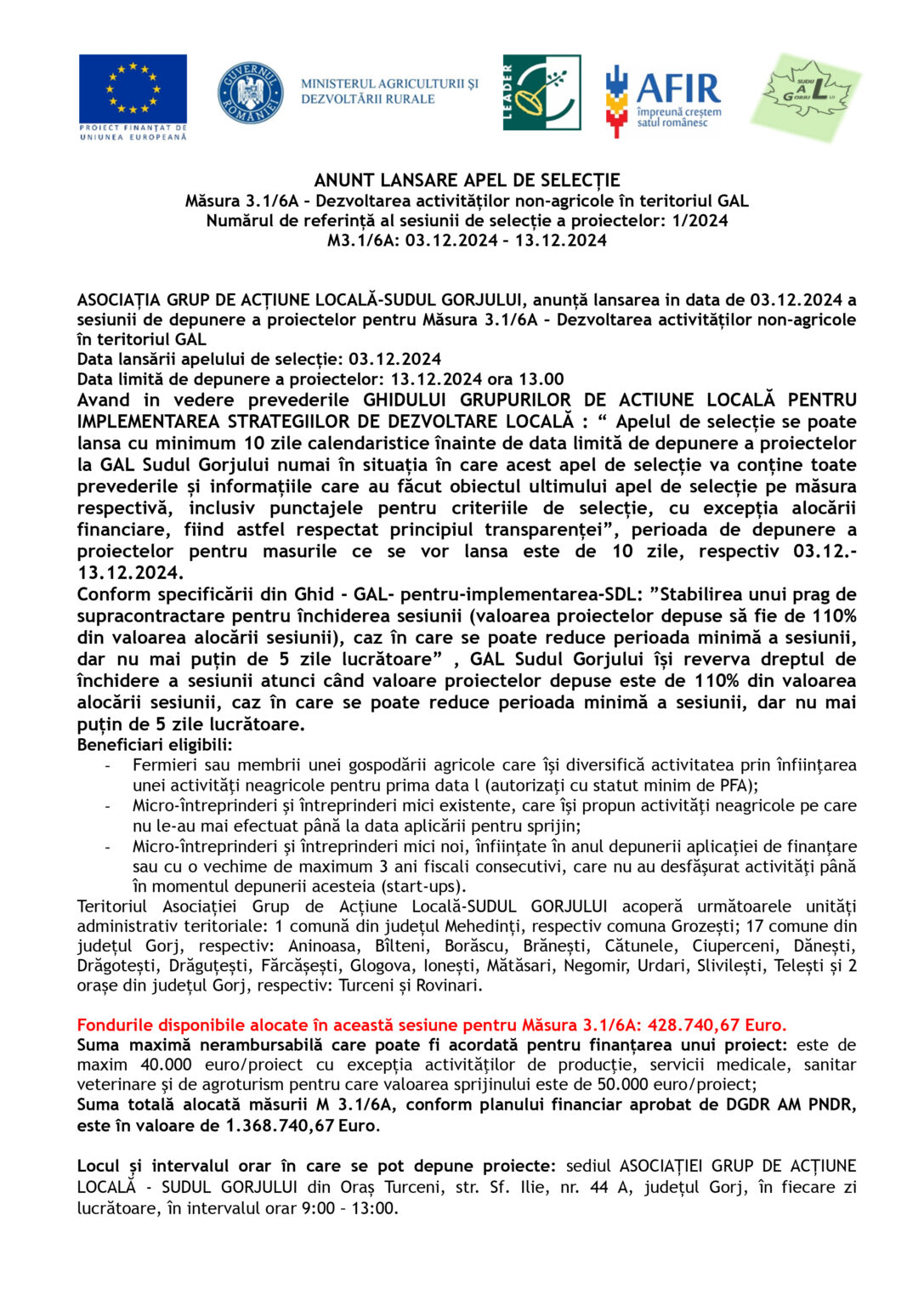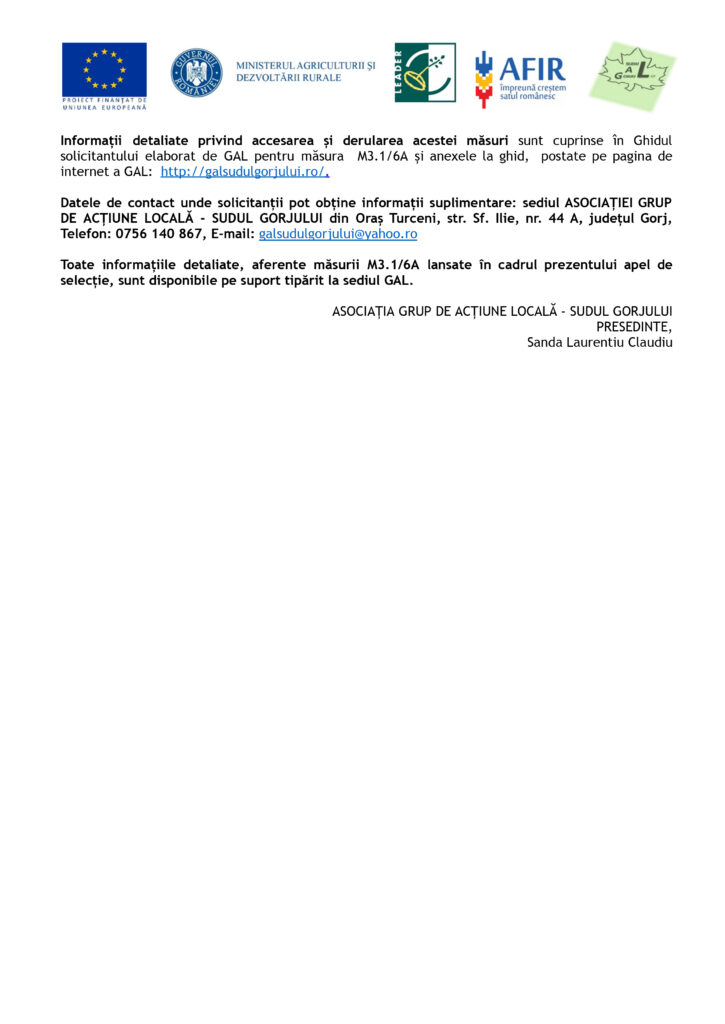 AnunturiANUNT LANSARE APEL DE SELECȚIE Măsura 3.1/6A – Dezvoltarea activităților non-agricole în teritoriul GAL Numărul de referință al sesiunii de selecție a proiectelor: 1/2024 M3.1/6A: 03.12.2024 – 13.12.2024 Jurnalul Olteniei 6 decembrie 2024 Share SHARE Jurnalul Olteniei See Full Bio Distribuie acest articol Facebook Whatsapp Whatsapp Email Copy Link Print Articolul precedent ANUNȚ LANSARE APEL DE SELECȚIE M 3.4/6B “Modernizarea localităților din cadrul GAL” Numărul de referință al sesiunii de selecție a proiectelor: 2/2024 M3.4/6B: 03.12.2024 – 13.12.2024 Articolul următor Oficial: Elena Lasconi este cu Călin Georgescu, în turul 2 Ultima ora Se știe grupa în care poate juca România la Cupa Mondială din 2026 5 decembrie 2025 Dolj: Ajutoare sociale de peste 76 milioane lei 5 decembrie 2025 Cea de-a VII-a ediție a Semimaratonului Craiovei a avut loc sâmbătă, 18 octombrie 2025. 5 decembrie 2025 ANUNT PRIVIND ORGANIZAREA ACHIZITIEI DE UTILAJE . MINIEXCAVATOR – LOTUL 1, UTILAJ DE FORAT HIDRAULIC – LOTUL 2 – RELUATÃ 2 5 decembrie 2025 Modernizarea CF Filiași: Începe proiectarea 5 decembrie 2025 Testare gratuită HPV la Spitalul Județean Târgu Jiu 5 decembrie 2025 CE Oltenia raportează emisii scăzute de dioxid de carbon 5 decembrie 2025 DIICOT a destructurat un grup de proxenetism în Mehedinți 5 decembrie 2025 Legea pensiilor magistraților, atacată, din nou, la CCR 5 decembrie 2025 Magia Crăciunului Târgu Jiu: Seară de neuitat 5 decembrie 2025