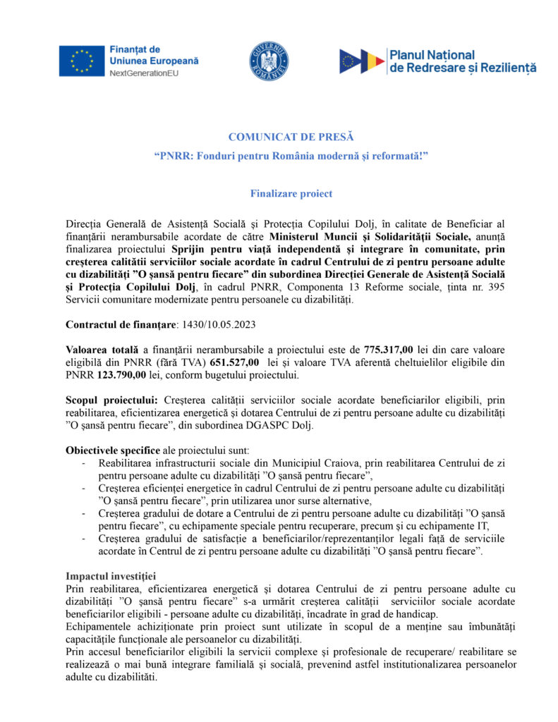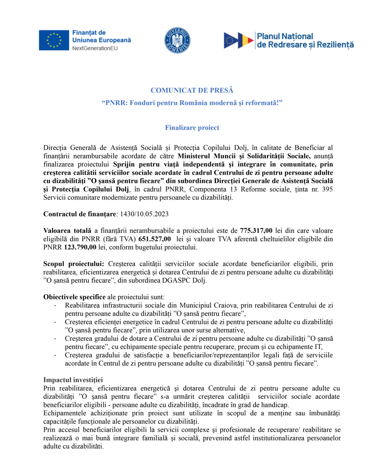 AnunturiCOMUNICAT DE PRESĂ – „PNRR: Fonduri pentru România modernă și reformată!” Jurnalul Olteniei 10 decembrie 2024 Share SHARE Jurnalul Olteniei See Full Bio Distribuie acest articol Facebook Whatsapp Whatsapp Email Copy Link Print Articolul precedent Moș Nicolae îi așteaptă pe copii la Clubul Nautic și de Agrement „Plaja Olt” Articolul următor COMUNICAT DE PRESĂ – „PNRR: Fonduri pentru România modernă și reformată!” Ultima ora Dolj: Ajutoare sociale de peste 76 milioane lei 5 decembrie 2025 Cea de-a VII-a ediție a Semimaratonului Craiovei a avut loc sâmbătă, 18 octombrie 2025. 5 decembrie 2025 ANUNT PRIVIND ORGANIZAREA ACHIZITIEI DE UTILAJE . MINIEXCAVATOR – LOTUL 1, UTILAJ DE FORAT HIDRAULIC – LOTUL 2 – RELUATÃ 2 5 decembrie 2025 Modernizarea CF Filiași: Începe proiectarea 5 decembrie 2025 Testare gratuită HPV la Spitalul Județean Târgu Jiu 5 decembrie 2025 CE Oltenia raportează emisii scăzute de dioxid de carbon 5 decembrie 2025 DIICOT a destructurat un grup de proxenetism în Mehedinți 5 decembrie 2025 Legea pensiilor magistraților, atacată, din nou, la CCR 5 decembrie 2025 Magia Crăciunului Târgu Jiu: Seară de neuitat 5 decembrie 2025 A dat bancnote false cu „Prop Copy”: Percheziții în Mehedinți 5 decembrie 2025