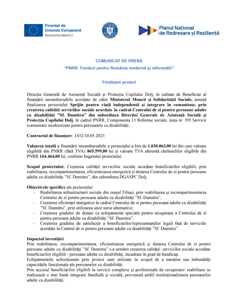 AnunturiCOMUNICAT DE PRESĂ – „PNRR: Fonduri pentru România modernă și reformată!” Jurnalul Olteniei 10 decembrie 2024 Share SHARE Jurnalul Olteniei See Full Bio Distribuie acest articol Facebook Whatsapp Whatsapp Email Copy Link Print Articolul precedent COMUNICAT DE PRESĂ – „PNRR: Fonduri pentru România modernă și reformată!” Articolul următor COMUNICAT DE PRESĂ – „PNRR: Fonduri pentru România modernă și reformată!” Ultima ora Cea de-a VII-a ediție a Semimaratonului Craiovei a avut loc sâmbătă, 18 octombrie 2025. 5 decembrie 2025 ANUNT PRIVIND ORGANIZAREA ACHIZITIEI DE UTILAJE . MINIEXCAVATOR – LOTUL 1, UTILAJ DE FORAT HIDRAULIC – LOTUL 2 – RELUATÃ 2 5 decembrie 2025 Modernizarea CF Filiași: Începe proiectarea 5 decembrie 2025 Testare gratuită HPV la Spitalul Județean Târgu Jiu 5 decembrie 2025 CE Oltenia raportează emisii scăzute de dioxid de carbon 5 decembrie 2025 DIICOT a destructurat un grup de proxenetism în Mehedinți 5 decembrie 2025 Legea pensiilor magistraților, atacată, din nou, la CCR 5 decembrie 2025 Magia Crăciunului Târgu Jiu: Seară de neuitat 5 decembrie 2025 A dat bancnote false cu „Prop Copy”: Percheziții în Mehedinți 5 decembrie 2025 Căprioare și ponei, de Crăciun, în Parcul Romanescu 5 decembrie 2025