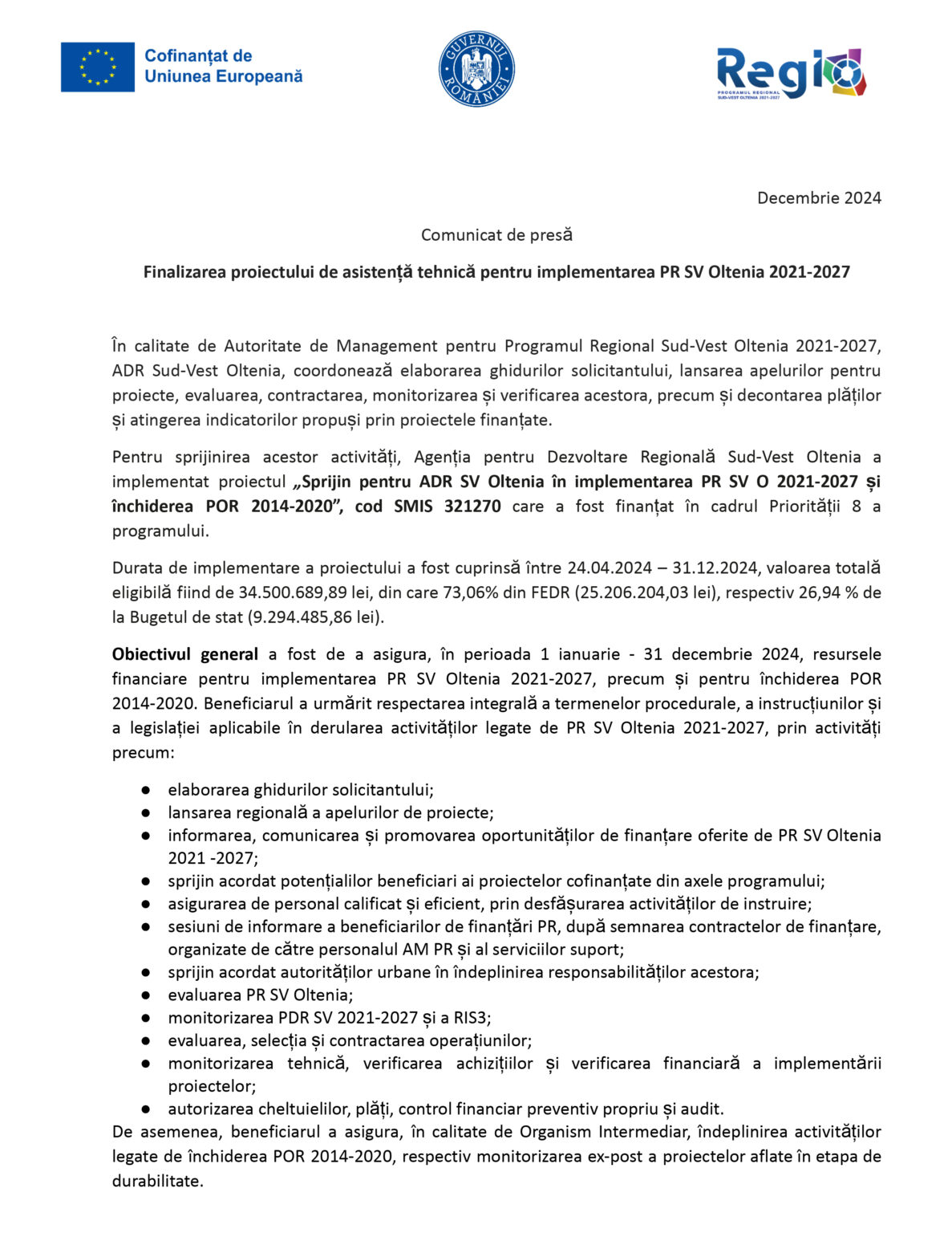 AnunturiFinalizarea proiectului de asistență tehnică pentru implementarea PR SV Oltenia 2021-2027 Jurnalul Olteniei 13 decembrie 2024 Share SHARE Jurnalul Olteniei See Full Bio Distribuie acest articol Facebook Whatsapp Whatsapp Email Copy Link Print Articolul precedent România și-a aflat adversarii din preliminariile Campionatului Mondial 2026 Articolul următor Doi tineri din Olt s-au răsturnat cu ATV-ul la Rânca Ultima ora David Popovici nu și-a primit banii de pe medalii 10 decembrie 2025 Muzeul Olteniei recreează tradițiile oltenești 10 decembrie 2025 Pericol pe șoselele din Olt: Tânăr, reținut după ce a fost prins beat și fără permis la volan 10 decembrie 2025 Copiii apelează la ChatGPT pentru sprijin emoțional 10 decembrie 2025 Primarul PNL la ședința AUR Slatina: „Nu a știut că sunt alegeri”. Explicațiile Mădălinei Văle despre momentul controversat 10 decembrie 2025 Ministrul Sănătății, pe șantierul Spitalului Regional 10 decembrie 2025 Alexandru Rogobete, fascinat de Târgul de Crăciun din Craiova: „Este fenomenal”. Azi merge la șantierul Spitalului Regional 10 decembrie 2025 Traficul pe DN7 – Valea Oltului a fost reluat 10 decembrie 2025 Universitatea Craiova și Zurli, solidaritate exemplară 10 decembrie 2025 Zile libere 2026: Ghidul minivacanțelor din România 10 decembrie 2025