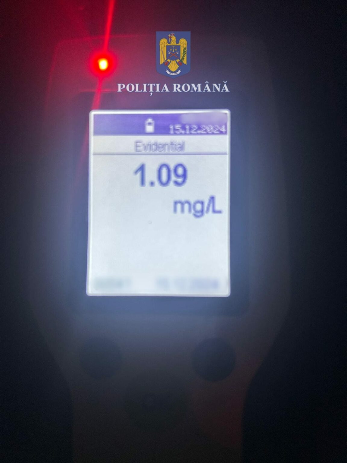 Întrucât conducătorul auto emana halenă alcoolică, polițiștii au procedat la testarea acestuia cu aparatul etilotest, care a indicat o valoare de 1,09 mg/l alcool pur în aerul expirat. Tânărul a fost condus la o unitate spitalicească pentru prelevarea de mostre biologice, în vederea stabilirii cu exactitate a alcoolemiei.