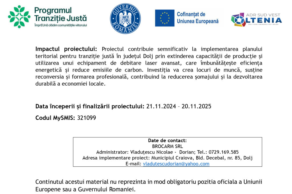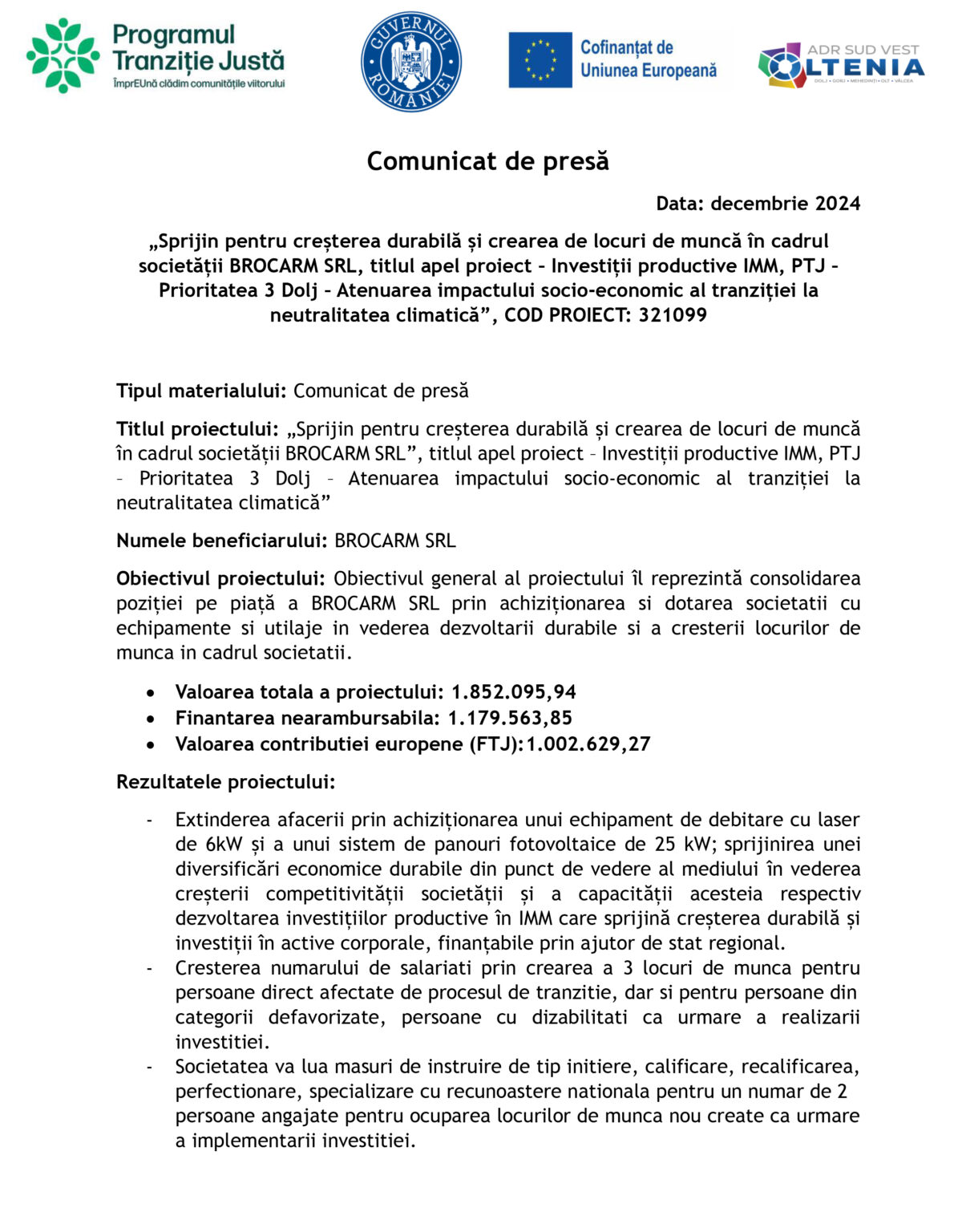 Comunicat de presă – „Sprijin pentru creșterea durabilă și crearea de locuri de muncă în cadrul societății BROCARM SRL, titlul apel proiect – Investiții productive IMM, PTJ – Prioritatea 3 Dolj – Atenuarea impactului socio-economic al tranziției la neutralitatea climatică”, COD PROIECT: 321099