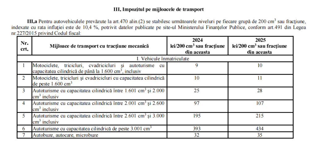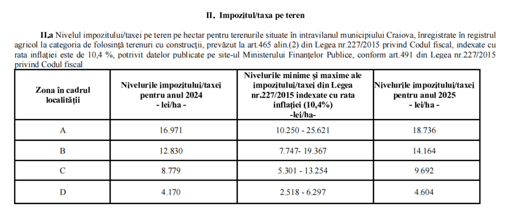 „Pentru crearea unei politici fiscale predictibile și creșterii încrederii cetățenilor și a mediului de afaceri, aspecte ce impun autorității deliberative locale adoptarea în cursul anului curent, cu aplicabilitate în anul fiscal următor, a impozitelor și taxelor locale, este necesar ca în anul 2025, nivelul impozitelor și taxelor locale care constau într-o anumită sumă în lei sau care sunt stabilite pe baza unei anumite sume în lei, precum și limitele amenzilor contravenționale să fie indexate cu rata inflației de 10,4%, comunicată pe site-urile oficiale ale Ministerului Finanțelor Publice și Ministerului Dezvoltării, Lucrărilor Publice și Administrației”, se menționează în raportul de specialitate.