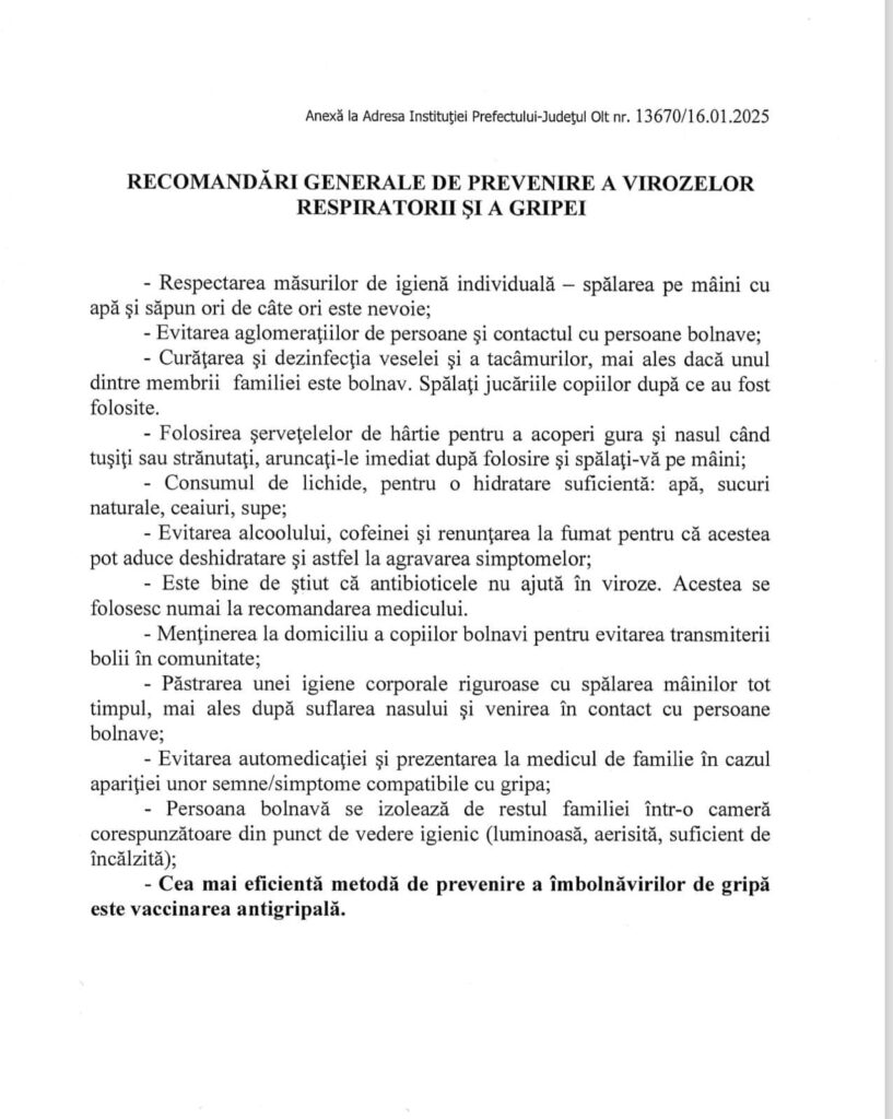 În caz de simptome, medicii recomandă menținerea la domiciliu a copiilor bolnavi pentru evitarea transmiterii bolii în comunitate, evitarea automedicației și prezentarea la medicul de familie în cazul apariției unor semne/simptome compatibile cu gripă. Persoana bolnavă trebuie să se izolează de restul familiei într-o cameră luminoasă, aerisită și suficient de bine încălzită”, transmit reprezentanții primăriei.