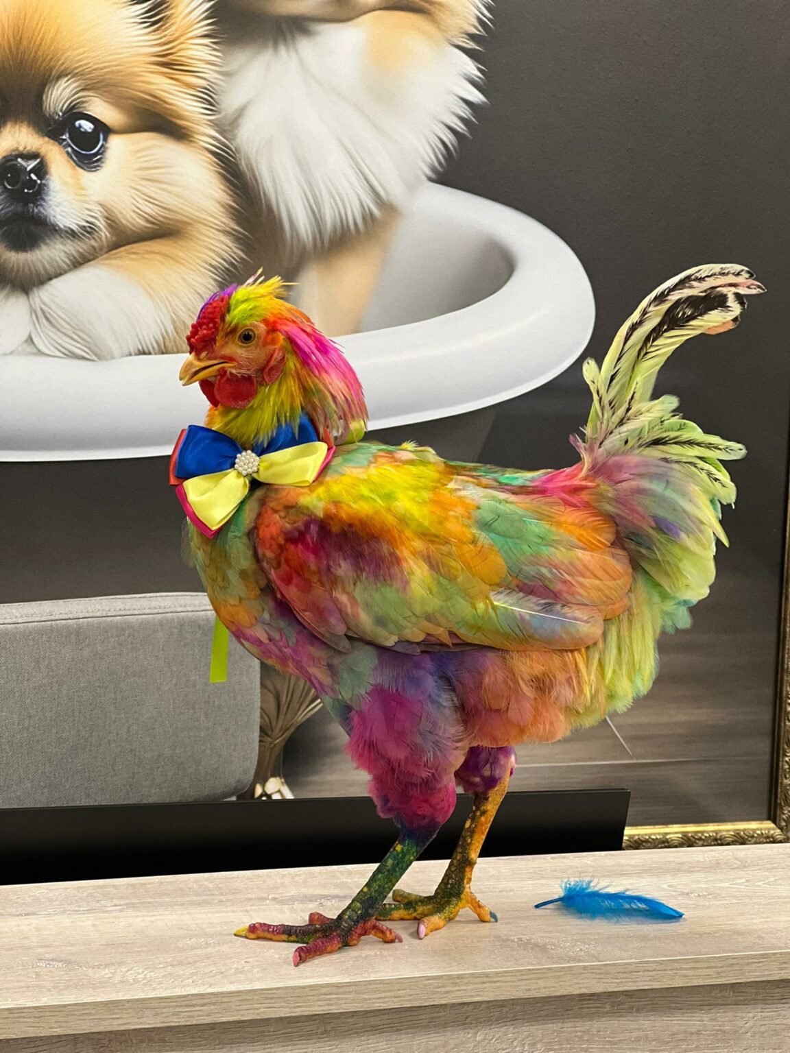 Vanesa, cunoscută pentru arta vopsirii creative a câinilor, duce acest concept la un nou nivel, prezentând primul cocoș vopsit profesionist din România. Inspirată de tendințele din America, unde găinile colorate au devenit un adevărat fenomen, ea a transformat un cocoș într-o veritabilă operă de artă vie. Acesta este acum scos la licitație pentru suma de 5.000 de euro.