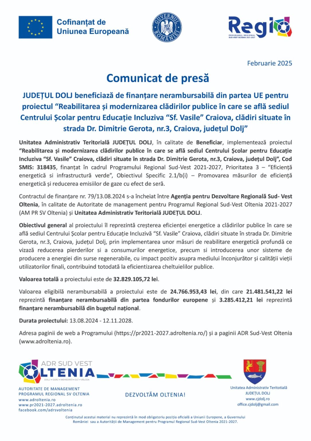 JUDEȚUL DOLJ beneficiază de finanțare nerambursabilă din partea UE pentru proiectul “Reabilitarea și modernizarea clădirilor publice în care se află sediul Centrului Școlar pentru Educație Incluziva “Sf. Vasile” Craiova, clădiri situate în strada Dr. Dimitrie Gerota, nr.3, Craiova, județul Dolj”