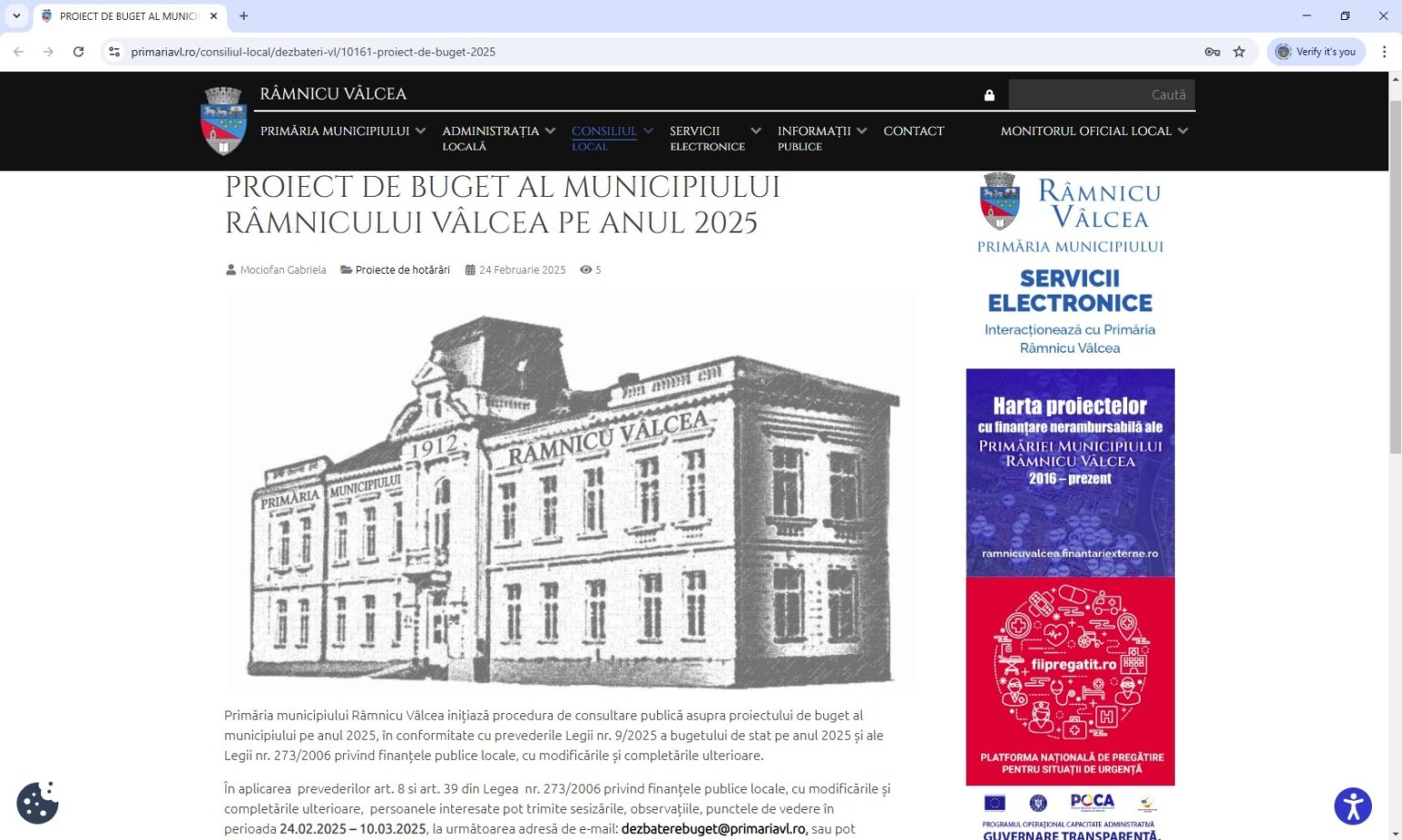 În conformitate cu prevederile Legii nr. 9/2025 a bugetului de stat pe anul 2025 și ale Legii nr. 273/2006 privind finanțele publice locale, cu modificările și completările ulterioare, Primăria municipiului Râmnicu Vâlcea a inițiat procedura de consultare publică asupra proiectului de buget al municipiului pe anul 2025 prin postarea acestuia pe site-ul propriu la adresa https://www.primariavl.ro/consiliul-local/dezbateri-vl/10161-proiect-de-buget-2025.