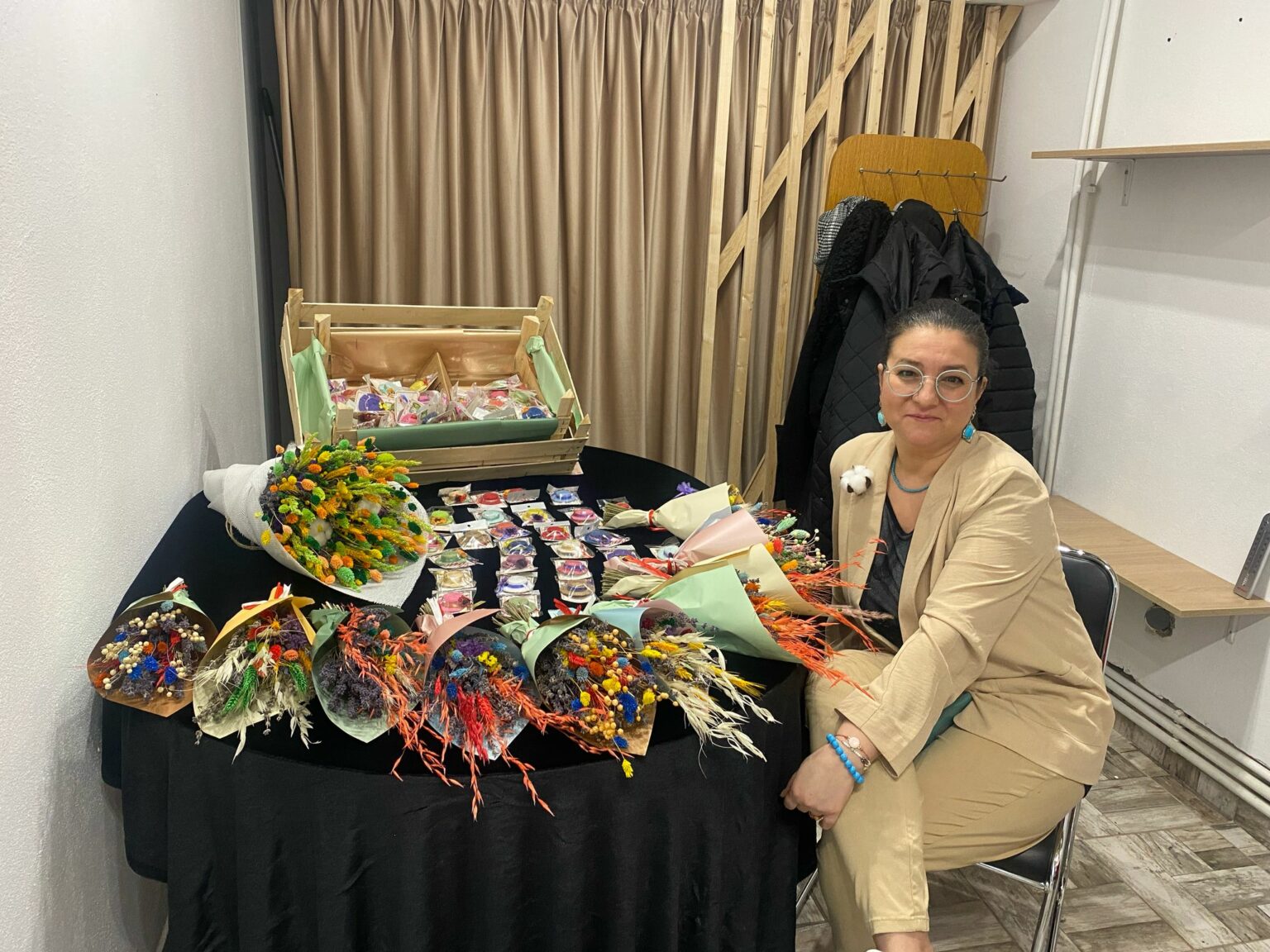 Mariana, profesoară de educație plastică, a prezentat lucrări de artizanat, inclusiv mărțișoare și coliere din lut polimeric, alături de tablouri din scoarță de copac.