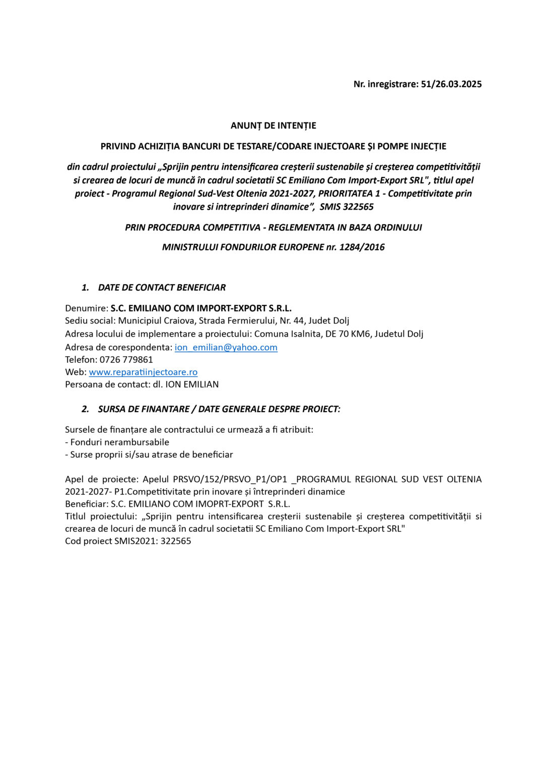 Anunț de intenție privind achiziția bancuri de testare/codare injectoare și pompe injecție