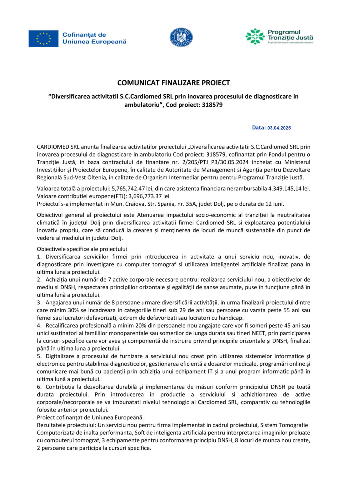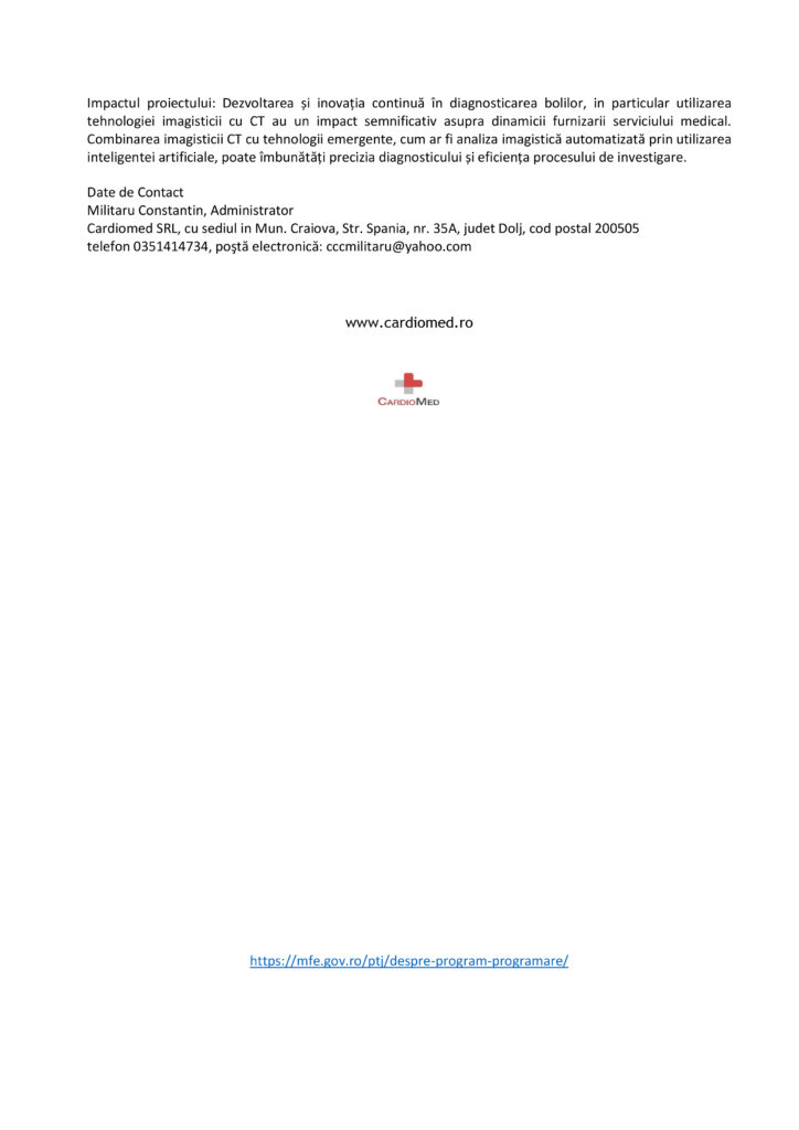 AnunturiCOMUNICAT FINALIZARE PROIECT – “Diversificarea activității S.C. Cardiomed SRL prin inovarea procesului de diagnosticare în ambulatoriu”, Cod proiect: 318579 Jurnalul Olteniei 3 aprilie 2025 Share SHARE Jurnalul Olteniei See Full Bio Distribuie acest articol Facebook Whatsapp Whatsapp Email Copy Link Print Articolul precedent Start la construcția Spitalului Regional de Urgență Craiova Articolul următor Ciocolată cu pietre, într-un lanț de magazine din România Ultima ora ANUNT PRIVIND ORGANIZAREA ACHIZITIEI DE UTILAJE . MINIEXCAVATOR – LOTUL 1, UTILAJ DE FORAT HIDRAULIC – LOTUL 2 – RELUATÃ 2 5 decembrie 2025 Modernizarea CF Filiași: Începe proiectarea 5 decembrie 2025 Testare gratuită HPV la Spitalul Județean Târgu Jiu 5 decembrie 2025 CE Oltenia raportează emisii scăzute de dioxid de carbon 5 decembrie 2025 DIICOT a destructurat un grup de proxenetism în Mehedinți 5 decembrie 2025 Legea pensiilor magistraților, atacată, din nou, la CCR 5 decembrie 2025 Magia Crăciunului Târgu Jiu: Seară de neuitat 5 decembrie 2025 A dat bancnote false cu „Prop Copy”: Percheziții în Mehedinți 5 decembrie 2025 Căprioare și ponei, de Crăciun, în Parcul Romanescu 5 decembrie 2025 Gorj: agresori reținuți și monitorizați electronic 5 decembrie 2025