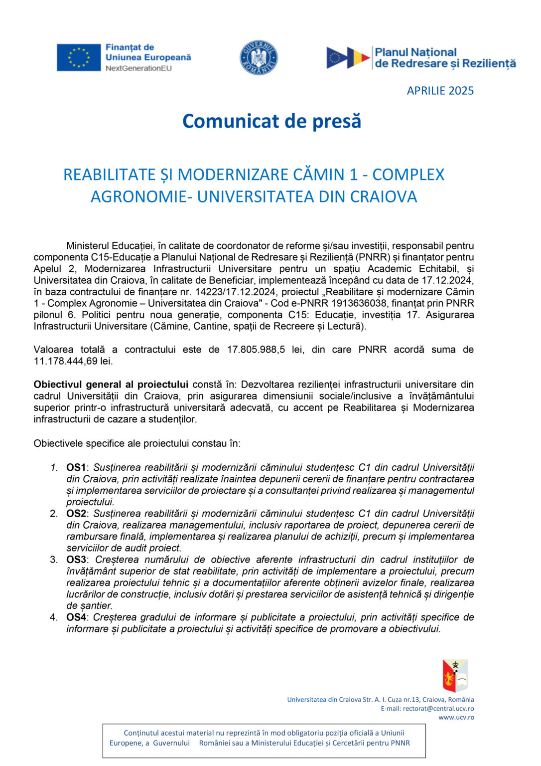 Comunicat de presă – Reabilitare și modernizare cămin C1 – Complex Agronomie – Universitatea din Craiova