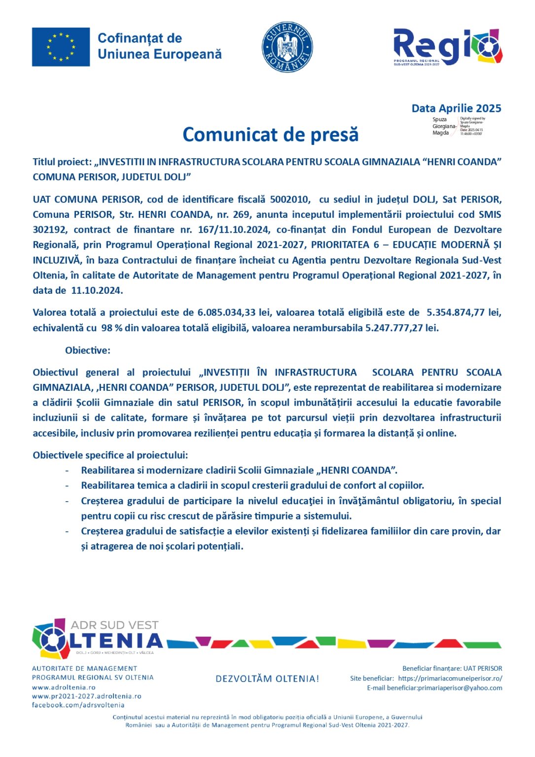 AnunturiComunicat de presă – Titlul proiect: „INVESTITII IN INFRASTRUCTURA SCOLARA PENTRU SCOALA GIMNAZIALA “HENRI COANDA” COMUNA PERISOR, JUDETUL DOLJ” Nedelea Raluca 17 aprilie 2025 Share SHARE Nedelea Raluca See Full Bio Distribuie acest articol Facebook Whatsapp Whatsapp Email Copy Link Print Articolul precedent Andrei Ivan poate să plece definitiv de la CSU Craiova. Sorin Cârțu explică situația Articolul următor Cozonaci cu până la 21 de E-uri. Compoziție înșelătoare și probleme la declarația nutrițională Ultima ora Se știe grupa în care poate juca România la Cupa Mondială din 2026 5 decembrie 2025 Dolj: Ajutoare sociale de peste 76 milioane lei 5 decembrie 2025 Cea de-a VII-a ediție a Semimaratonului Craiovei a avut loc sâmbătă, 18 octombrie 2025. 5 decembrie 2025 ANUNT PRIVIND ORGANIZAREA ACHIZITIEI DE UTILAJE . MINIEXCAVATOR – LOTUL 1, UTILAJ DE FORAT HIDRAULIC – LOTUL 2 – RELUATÃ 2 5 decembrie 2025 Modernizarea CF Filiași: Începe proiectarea 5 decembrie 2025 Testare gratuită HPV la Spitalul Județean Târgu Jiu 5 decembrie 2025 CE Oltenia raportează emisii scăzute de dioxid de carbon 5 decembrie 2025 DIICOT a destructurat un grup de proxenetism în Mehedinți 5 decembrie 2025 Legea pensiilor magistraților, atacată, din nou, la CCR 5 decembrie 2025 Magia Crăciunului Târgu Jiu: Seară de neuitat 5 decembrie 2025