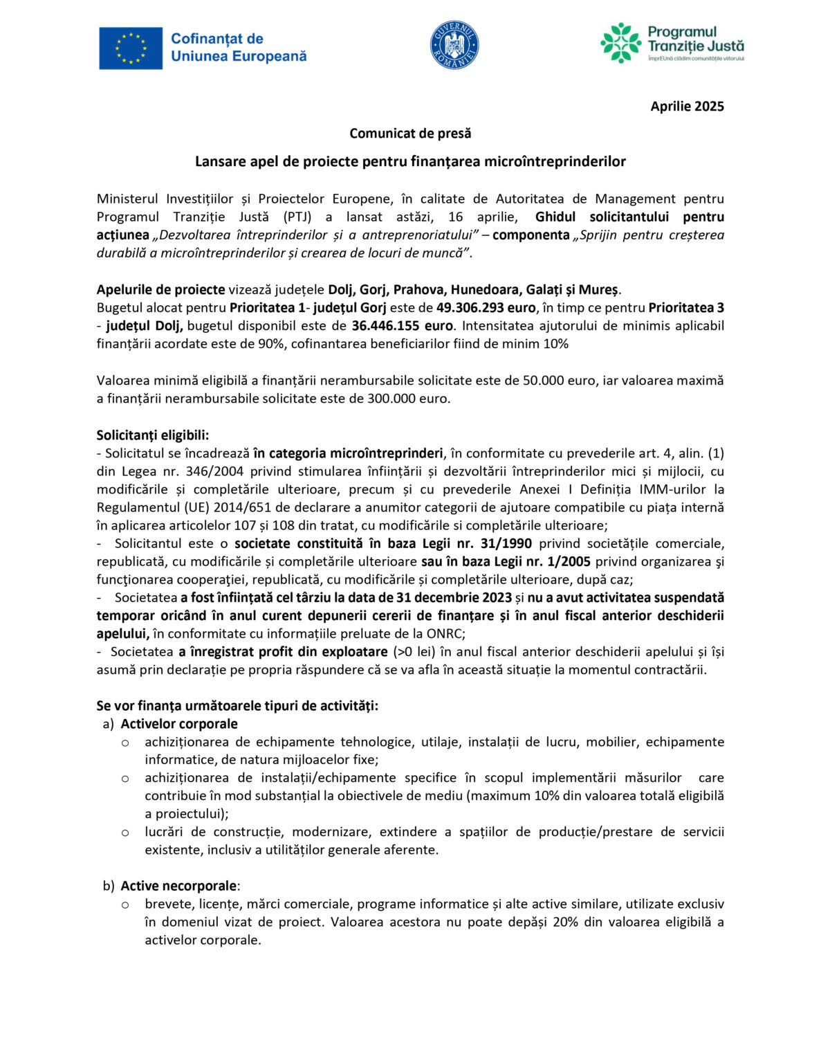 Ministerul Investițiilor și Proiectelor Europene, în calitate de Autoritatea de Management pentru Programul Tranziție Justă (PTJ) a lansat astăzi, 16 aprilie,  Ghidul solicitantului pentru acțiunea „Dezvoltarea întreprinderilor și a antreprenoriatului” – componenta „Sprijin pentru creșterea durabilă a microîntreprinderilor și crearea de locuri de muncă”.