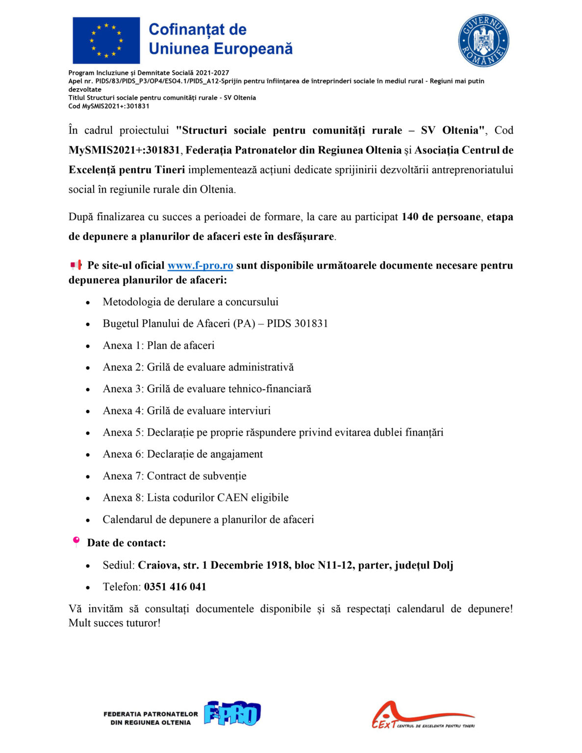 În cadrul proiectului „Structuri sociale pentru comunități rurale – SV Oltenia”, Cod MySMIS2021+:301831, Federația Patronatelor din Regiunea Oltenia și Asociația Centrul de Excelență pentru Tineri implementează acțiuni dedicate sprijinirii dezvoltării antreprenoriatului social în regiunile rurale din Oltenia.