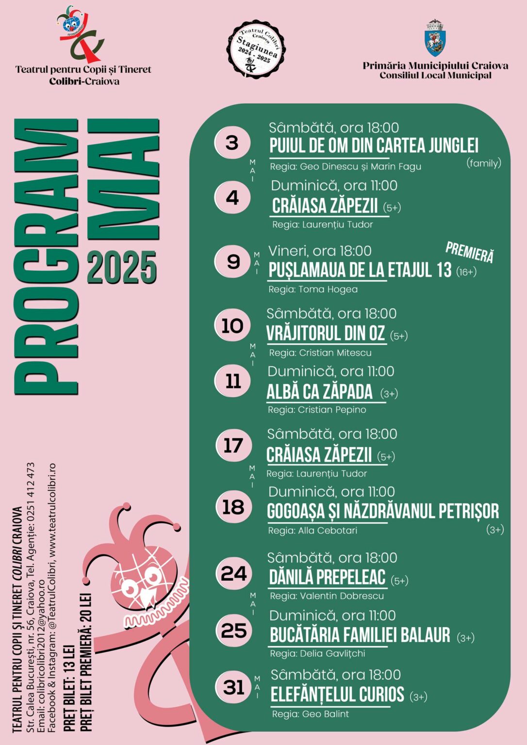Sâmbătă, 10 mai 2025, la ora 18:00 copiii se vor bucura despectacolul Vrăjitorul din Oz“, adaptare după L. Frank Baum, scenariul şi regia Cristian Mitescu, scenografia Eugenia Tărăşescu – Jianu, asistent scenografie: Nichita Teodorescu, muzica Alexandru Berehoi, coregrafia Ionuţ Sergiu Anghel, cu actorii: Marin Fagu, Alis Ianoş, Cosmin Dolea, Emanuel Popescu, Daniel Mirea, Ionica Dobrescu, Geo Dinescu, Adriana Ioncu, Alla Cebotari, voci: Rodica Prisăcaru, Mugur Prisăcaru.