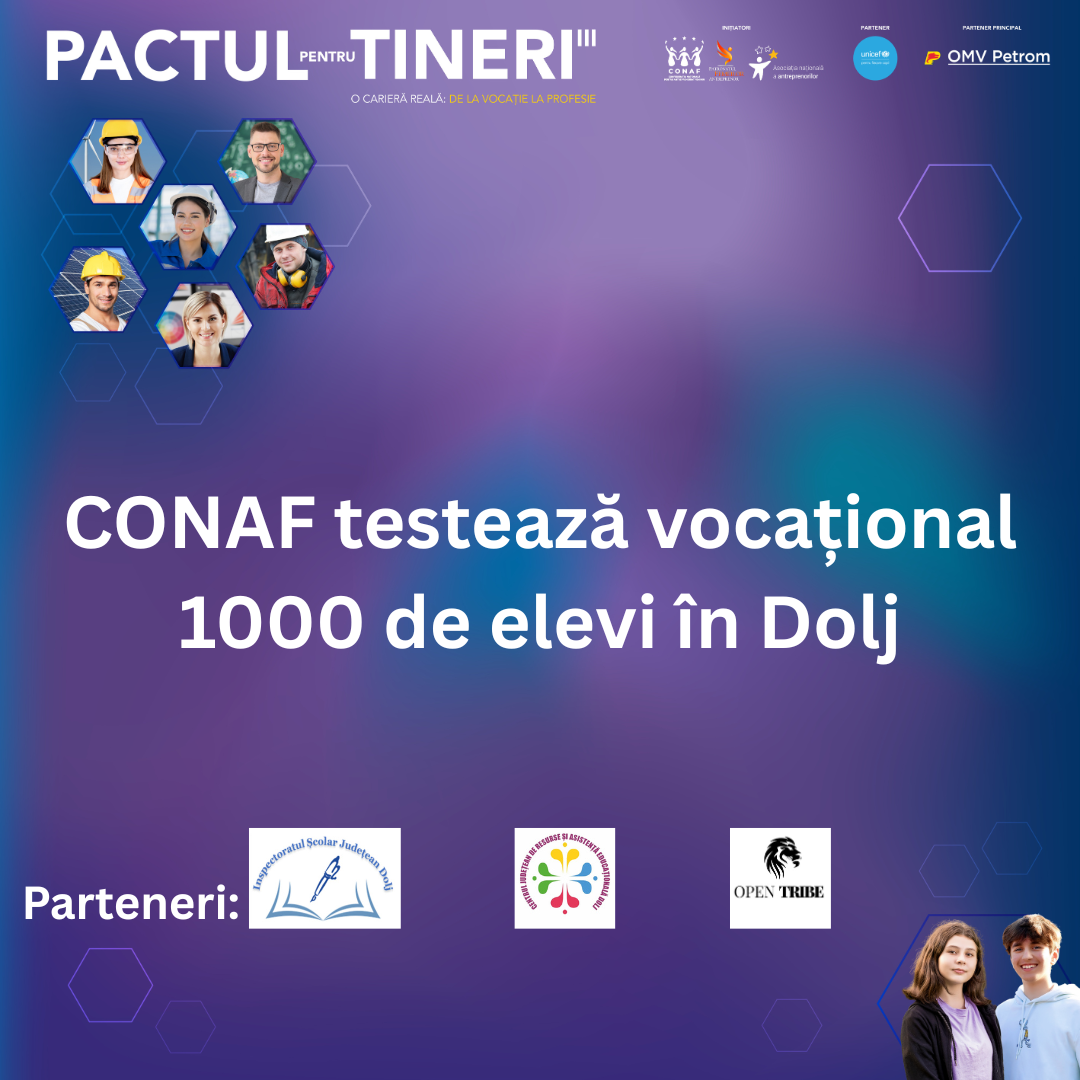 Într-o Românie în care decalajul dintre ceea ce învață elevii și ceea ce cere piața muncii se adâncește de la un an la altul, în care opțiunile școlare sunt adesea alegeri ale hazardului și nu rezultate ale cunoașterii de sine, Confederația Națională pentru Antreprenoriat Feminin (CONAF) face un pas strategic care vizează reconectarea educației cu nevoile reale ale pieței muncii. În cadrul celei de-a treia ediții a programului „Pactul pentru Tineri – O carieră reală. De la vocație la profesie”, CONAF, în parteneriat cu UNICEF România, a demarat un amplu proces de testare vocațională a elevilor de clasele a VII a și a VIII a din județul Dolj, un demers menit să reformeze modul în care România investește în viitorul capitalului său uman.