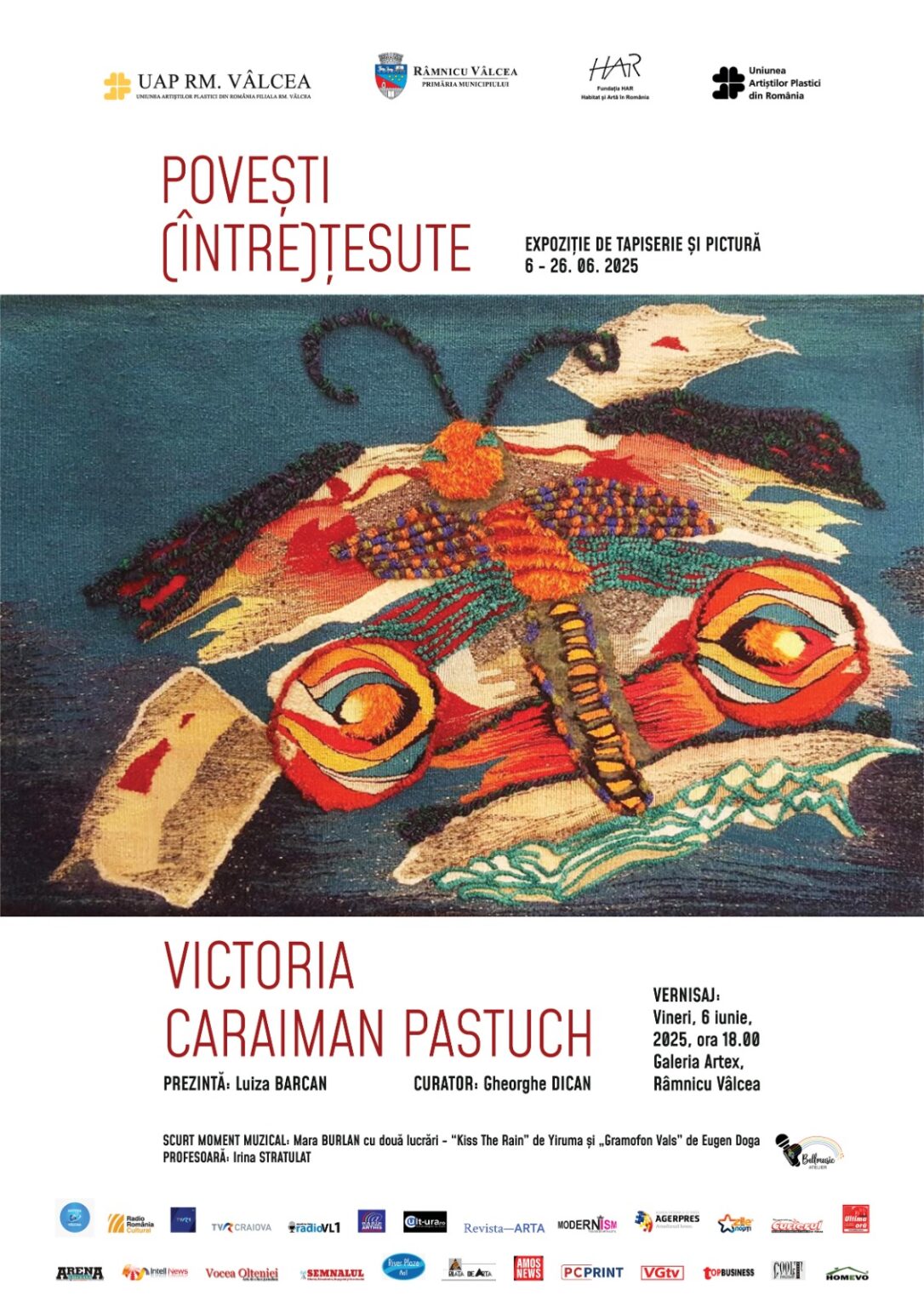 În perioada 6–26 iunie 2025, Galeriile de Artă „Artex” din Râmnicu Vâlcea găzduiesc o expoziție de artă decorativă cu totul specială: „Povești (între)țesute”, semnată de artista Victoria Caraiman Pastuch. Evenimentul este organizat de Uniunea Artiștilor Plastici din România – Filiala Râmnicu Vâlcea, în parteneriat cu Primăria Municipiului Râmnicu Vâlcea și Fundația HAR (Habitat și Artă în România).