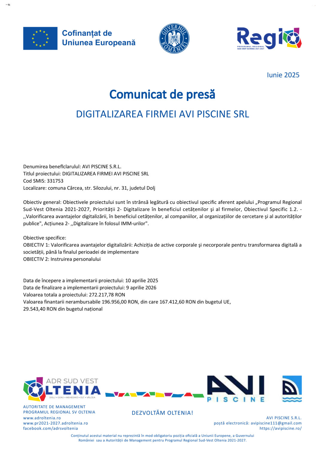 Comunicat de presă – Digitalizarea firmei Avi Piscine SRL