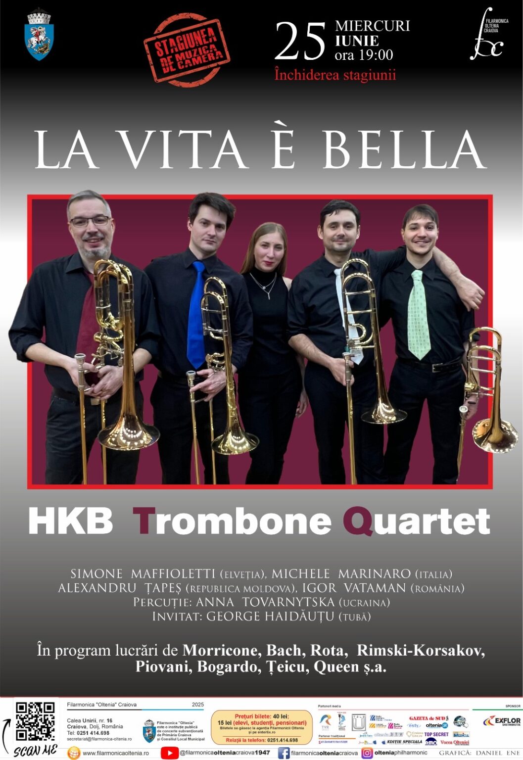 Sub titlul „La Vita è Bella”, publicul este invitat să descopere un program plin de contraste și bucurie sonoră, în interpretarea HKB Trombone Quartet – un ansamblu cosmopolit, format din artiști originari din Elveția (Simone Maffioletti), Italia (Michele Marinaro), Republica Moldova (Alexandru Țapeș) și România (Igor Vataman). Li se alătură Anna Tovarnytska (Ucraina) la percuție și George Hăidăuțu la tubă, într-o formulă care aduce multă culoare și forță expresivă.