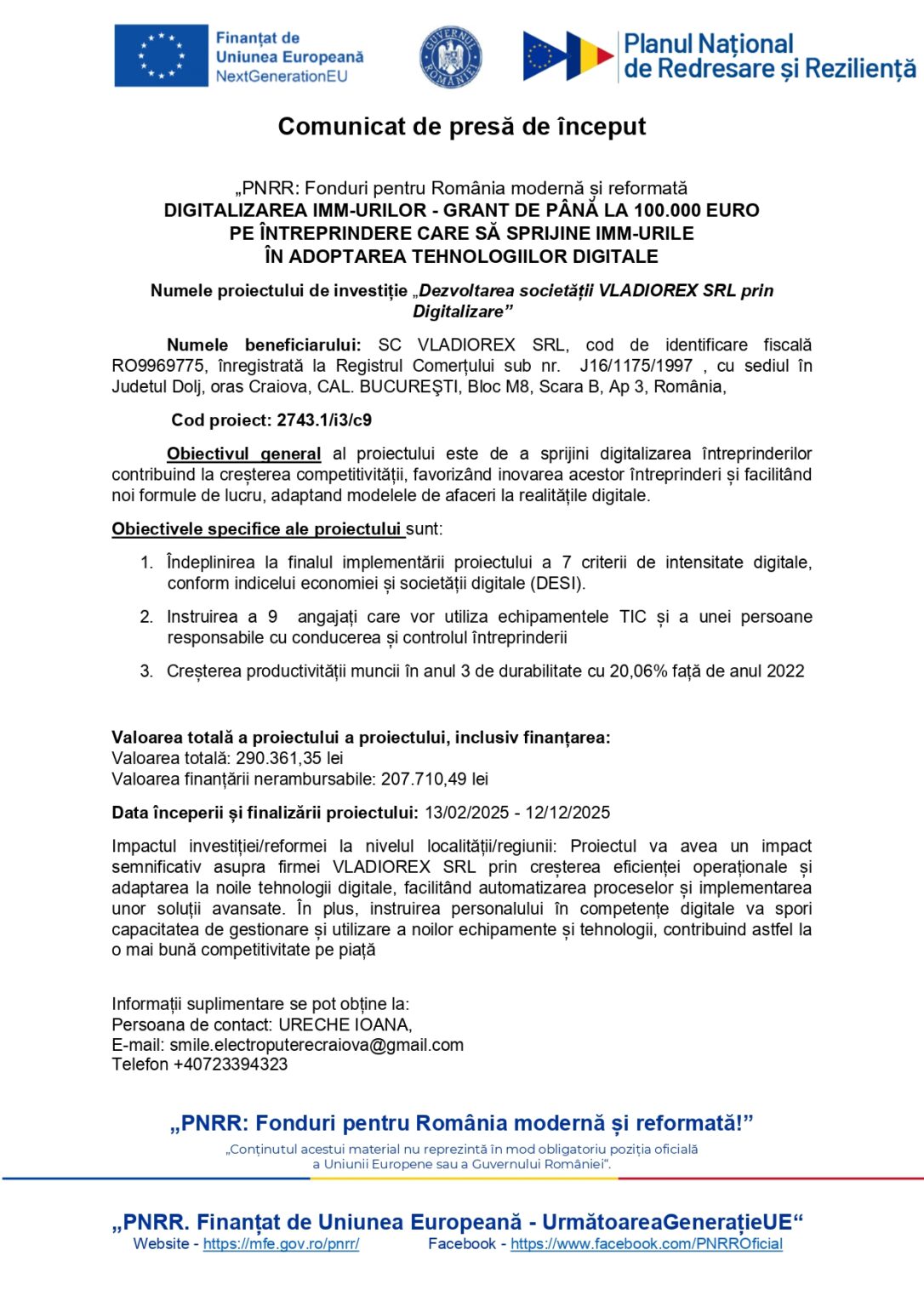 AnunturiOlteniaComunicat de presă de început – „PNRR: Fonduri pentru România modernă și reformată” DIGITALIZAREA IMM-URILOR – GRANT DE PÂNĂ LA 100.000 EURO PE ÎNTREPRINDERE CARE SĂ SPRIJINE IMM-URILE ÎN ADOPTAREA TEHNOLOGIILOR DIGITALE Jurnalul Olteniei 26 iunie 2025 Share SHARE Jurnalul Olteniei See Full Bio Distribuie acest articol Facebook Whatsapp Whatsapp Email Copy Link Print Articolul precedent Rețeaua de irigații din Mehedinți, în modernizare Articolul următor ANRE anunță majorări la tarifele de distribuție a gazelor, de la 1 iulie Ultima ora Dolj: Ajutoare sociale de peste 76 milioane lei 5 decembrie 2025 Cea de-a VII-a ediție a Semimaratonului Craiovei a avut loc sâmbătă, 18 octombrie 2025. 5 decembrie 2025 ANUNT PRIVIND ORGANIZAREA ACHIZITIEI DE UTILAJE . MINIEXCAVATOR – LOTUL 1, UTILAJ DE FORAT HIDRAULIC – LOTUL 2 – RELUATÃ 2 5 decembrie 2025 Modernizarea CF Filiași: Începe proiectarea 5 decembrie 2025 Testare gratuită HPV la Spitalul Județean Târgu Jiu 5 decembrie 2025 CE Oltenia raportează emisii scăzute de dioxid de carbon 5 decembrie 2025 DIICOT a destructurat un grup de proxenetism în Mehedinți 5 decembrie 2025 Legea pensiilor magistraților, atacată, din nou, la CCR 5 decembrie 2025 Magia Crăciunului Târgu Jiu: Seară de neuitat 5 decembrie 2025 A dat bancnote false cu „Prop Copy”: Percheziții în Mehedinți 5 decembrie 2025