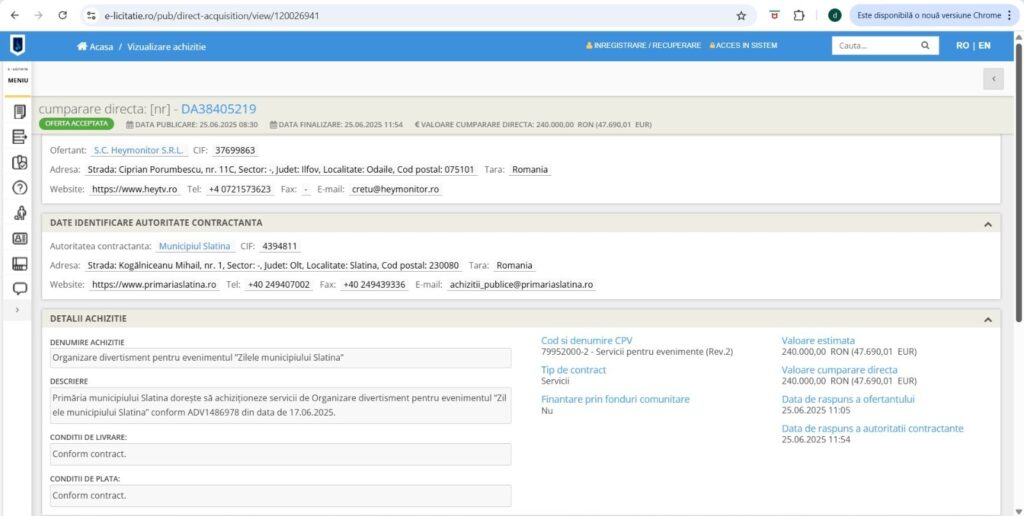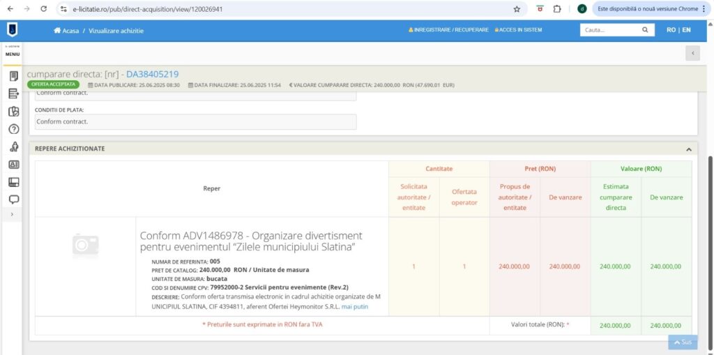 Potrivit Sistemului de licitaţii publice, atribuirea s-a făcut pe 25 iunie 2025, iar evenimentul este programat să se desfăşoare trei zile mai târziu, pe 28 iunie 2025.