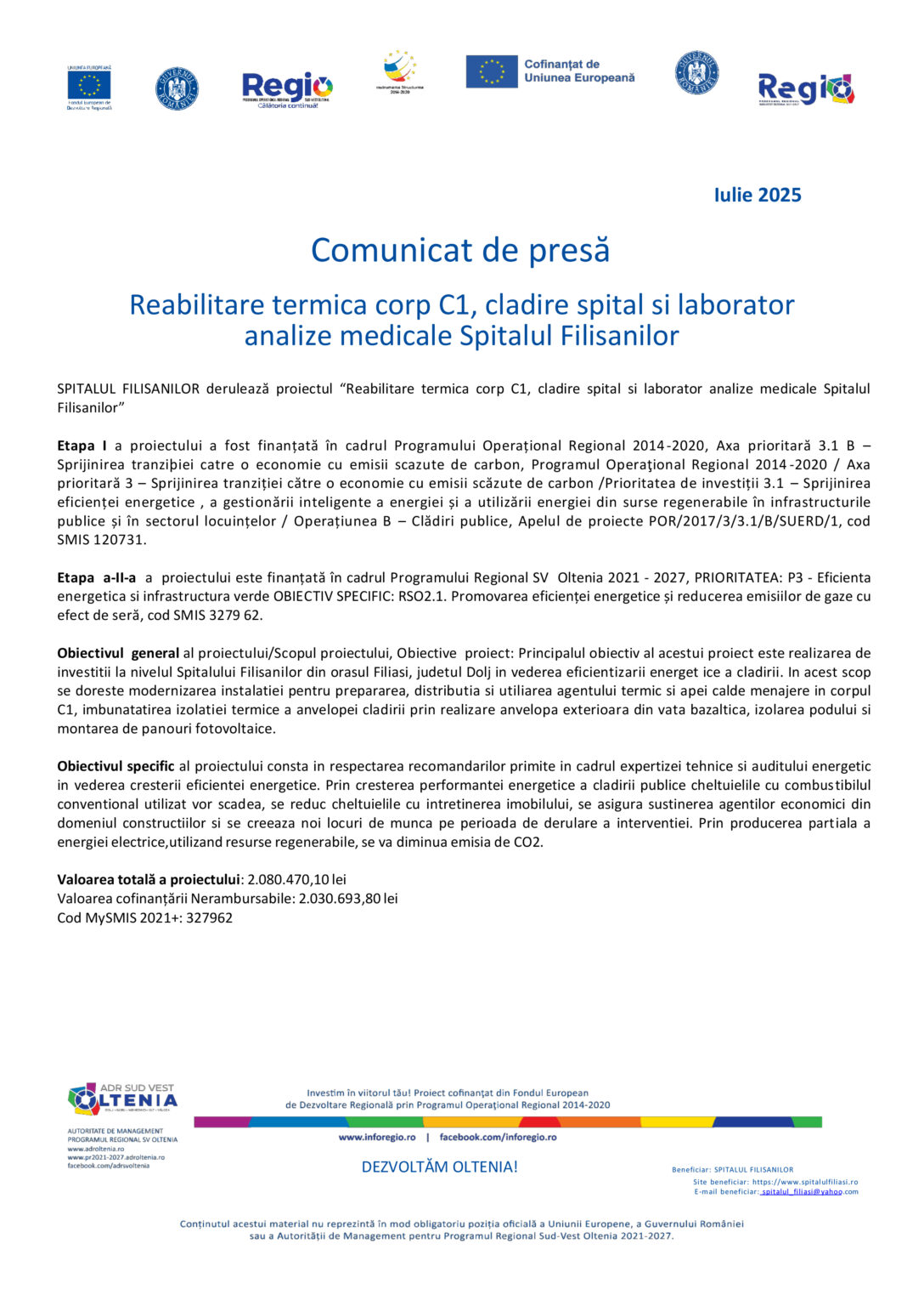 AnunturiDoljPrincipaleComunicat de presă – Reabilitare termică corp C1, clădire spital și laborator analize medicale Spitalul Filișanilor Jurnalul Olteniei 4 iulie 2025 Share SHARE Jurnalul Olteniei See Full Bio Distribuie acest articol Facebook Whatsapp Whatsapp Email Copy Link Print Articolul precedent A fost desemnată oferta câștigătoare pentru Lotul 2 al reabilitării liniei feroviare Craiova – Caransebeș Articolul următor Pachetul fiscal al lui Bolojan, criticat din PNL. Primarul Slatinei sare la gâtul premierului Ultima ora Un fost jucător de la Universitatea Craiova, inclus în echipa lunii noiembrie, în Liga 2 5 decembrie 2025 Rusia blochează platforma de jocuri online Roblox 5 decembrie 2025 Cupa României: clasamentul și rezultatele din grupe 5 decembrie 2025 Cloud Dancer – Culoarea anului 2026 aleasă de Pantone 5 decembrie 2025 Râmnicu Vâlcea deschide sezonul sărbătorilor cu o seară specială de Ajunul lui Moș Nicolae 4 decembrie 2025 Ecranele, „cadoul otrăvit” pentru copii de sărbători 5 decembrie 2025 Al doilea spectacol al Festivalului Colindului Vâlcean are loc la Vlădești 4 decembrie 2025 Universitatea Craiova câștigă la scor și urcă pe primul loc în grupa din Cupa României 5 decembrie 2025 Bărbat reținut pentru agresiune sexuală la Râmnicu Vâlcea 4 decembrie 2025 Doi vâlceni după gratii pentru violență și trafic de droguri 4 decembrie 2025