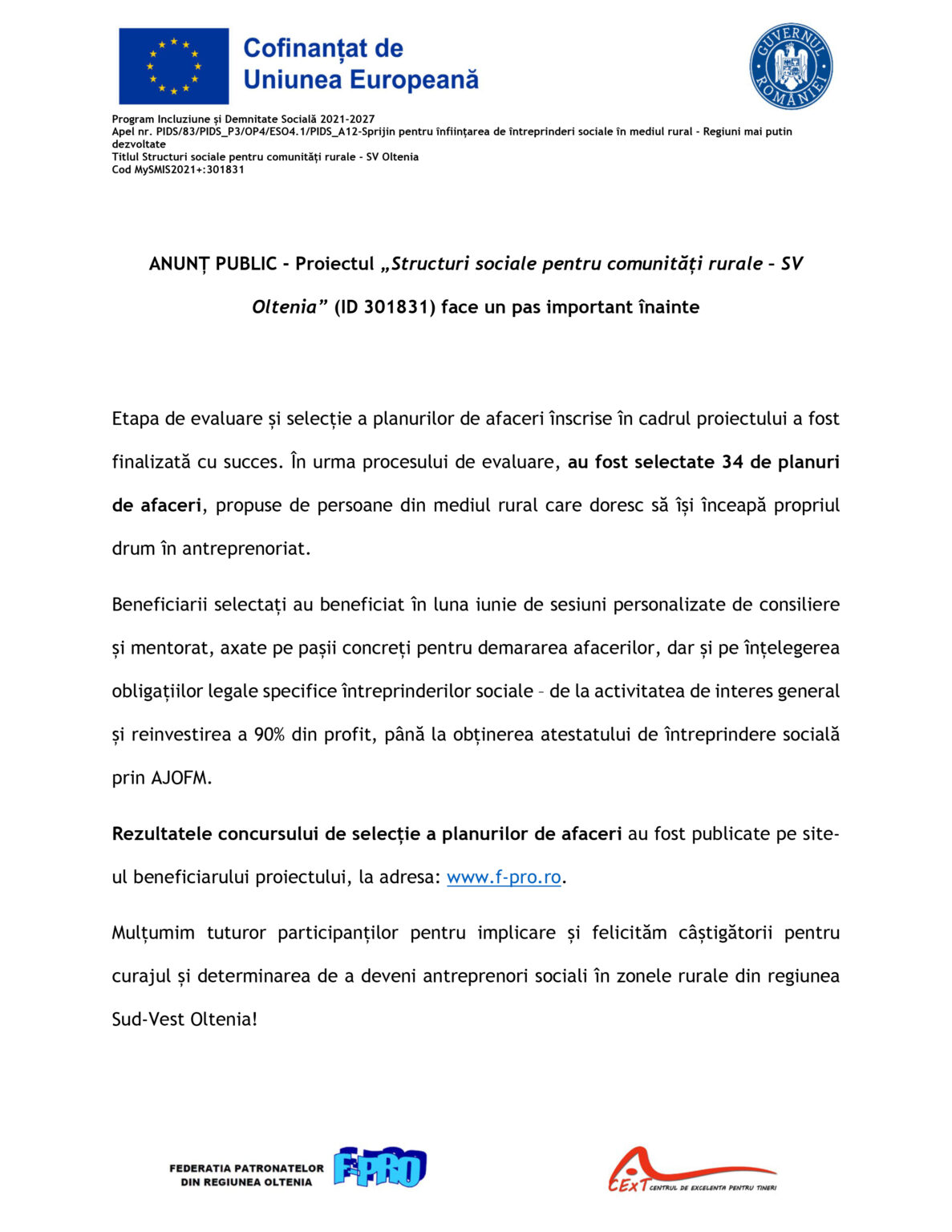 AnunturiAnunț public – Proiectul „Structuri sociale pentru comunități rurale – SV Oltenia” (ID 301831) face un pas înainte Jurnalul Olteniei 9 iulie 2025 Share SHARE Jurnalul Olteniei See Full Bio Distribuie acest articol Facebook Whatsapp Whatsapp Email Copy Link Print Articolul precedent Mario De Mezzo, un nou atac la Ilie Bolojan: Oamenii îmi vor reproșa mie pentru că nu au contact cu dumneavoastră Articolul următor Anunț public Ultima ora Testare gratuită HPV la Spitalul Județean Târgu Jiu 5 decembrie 2025 CE Oltenia raportează emisii scăzute de dioxid de carbon 5 decembrie 2025 DIICOT a destructurat un grup de proxenetism în Mehedinți 5 decembrie 2025 Legea pensiilor magistraților, atacată, din nou, la CCR 5 decembrie 2025 Magia Crăciunului Târgu Jiu: Seară de neuitat 5 decembrie 2025 A dat bancnote false cu „Prop Copy”: Percheziții în Mehedinți 5 decembrie 2025 Căprioare și ponei, de Crăciun, în Parcul Romanescu 5 decembrie 2025 Gorj: agresori reținuți și monitorizați electronic 5 decembrie 2025 Suspect de tentativă de agresiune reținut de Poliția Dolj 5 decembrie 2025 Locuință din Gorj cuprinsă de flăcări 5 decembrie 2025