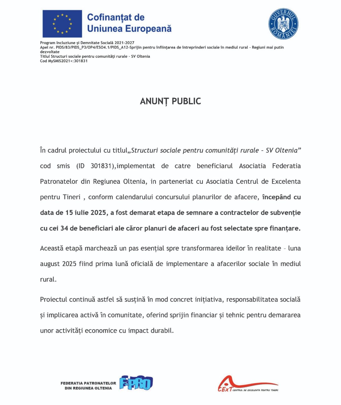 AnunturiAnunț public lansare etapă de semnare a contractelor de subvenție Jurnalul Olteniei 17 iulie 2025 Share #image_title SHARE Jurnalul Olteniei See Full Bio Distribuie acest articol Facebook Whatsapp Whatsapp Email Copy Link Print Articolul precedent Anunț public lansare etapă de semnare contracte subvenție Articolul următor O nouă tragedie pe calea ferată în județul Gorj Ultima ora Se știe grupa în care poate juca România la Cupa Mondială din 2026 5 decembrie 2025 Dolj: Ajutoare sociale de peste 76 milioane lei 5 decembrie 2025 Cea de-a VII-a ediție a Semimaratonului Craiovei a avut loc sâmbătă, 18 octombrie 2025. 5 decembrie 2025 ANUNT PRIVIND ORGANIZAREA ACHIZITIEI DE UTILAJE . MINIEXCAVATOR – LOTUL 1, UTILAJ DE FORAT HIDRAULIC – LOTUL 2 – RELUATÃ 2 5 decembrie 2025 Modernizarea CF Filiași: Începe proiectarea 5 decembrie 2025 Testare gratuită HPV la Spitalul Județean Târgu Jiu 5 decembrie 2025 CE Oltenia raportează emisii scăzute de dioxid de carbon 5 decembrie 2025 DIICOT a destructurat un grup de proxenetism în Mehedinți 5 decembrie 2025 Legea pensiilor magistraților, atacată, din nou, la CCR 5 decembrie 2025 Magia Crăciunului Târgu Jiu: Seară de neuitat 5 decembrie 2025