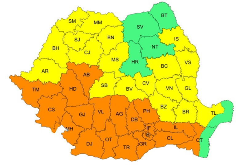 Vineri de la ora 10 – 26 iulie, ora 10, este în vigoare un cod portocaliu de caniculă în Oltenia, Banat, cea mai mare parte a Munteniei, în sud-vestul Transilvaniei, precum și în sudul Dobrogei continentale.