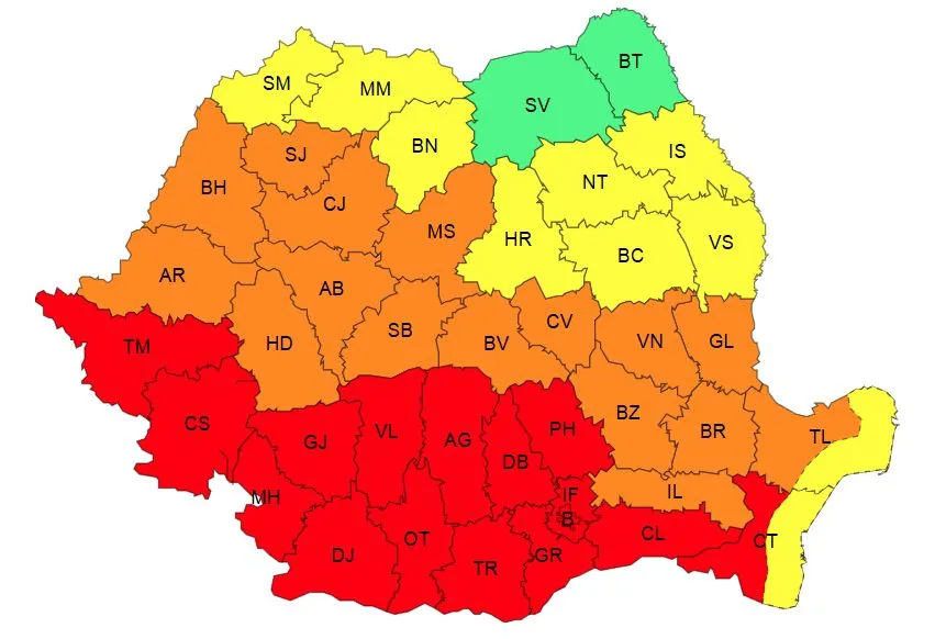 Administraţia Naţională de Meteorologie a emis o avertizare Cod roşu de caniculă, disconfort termic deosebit de accentuat, noapte tropicală, pentru 15 judeţe şi municipiul Bucureşti.