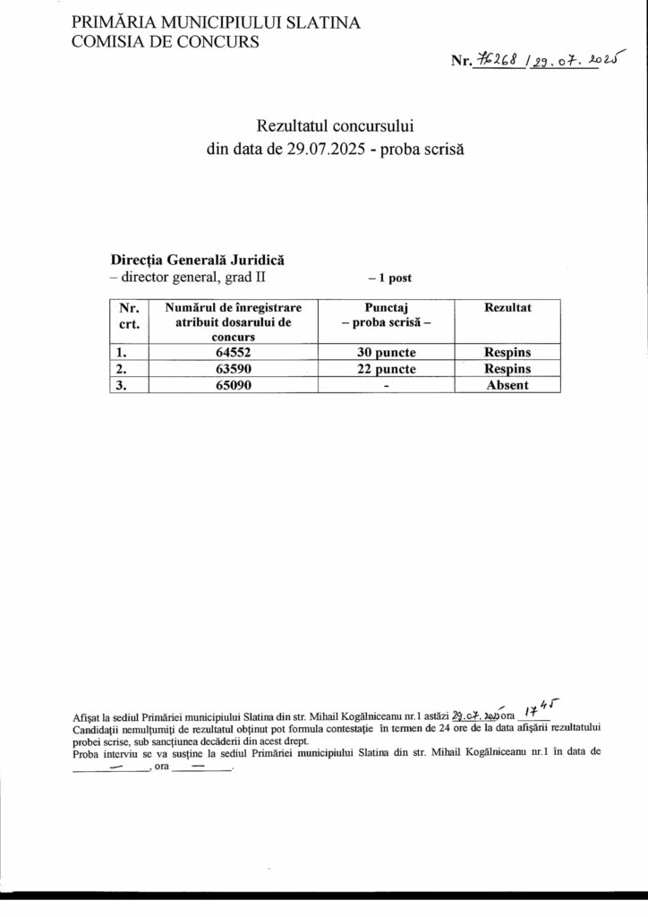 Potrivit rezultatelor postate pe portalul Primăriei Slatina, nici Valeriu Matei şi nici contracandidatul său n-au reuşit să obţină punctajul minim pentru promovarea probei scrise.
