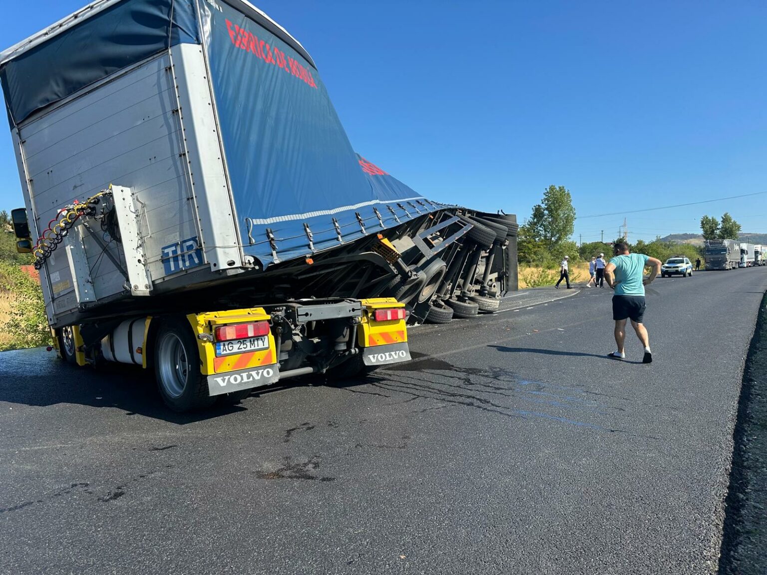 „ Cu puțin timp în urmă, Detașamentul de Pompieri Drobeta Turnu Severin a fost solicitat să intervină pentru gestionarea unui accident rutier produs pe centura ocolitoare a municipiului Drobeta Turnu Severin, în care un autotren a părăsit partea carosabilă. La fața locului s-au deplasat de urgență 5 subofițeri cu o autospecială de stingere. Aceștia au asigurat măsurile de apărare împotriva incendiilor la locul evenimentului, nefiind înregistrate victime”, a spus ISU Mehedinți.
