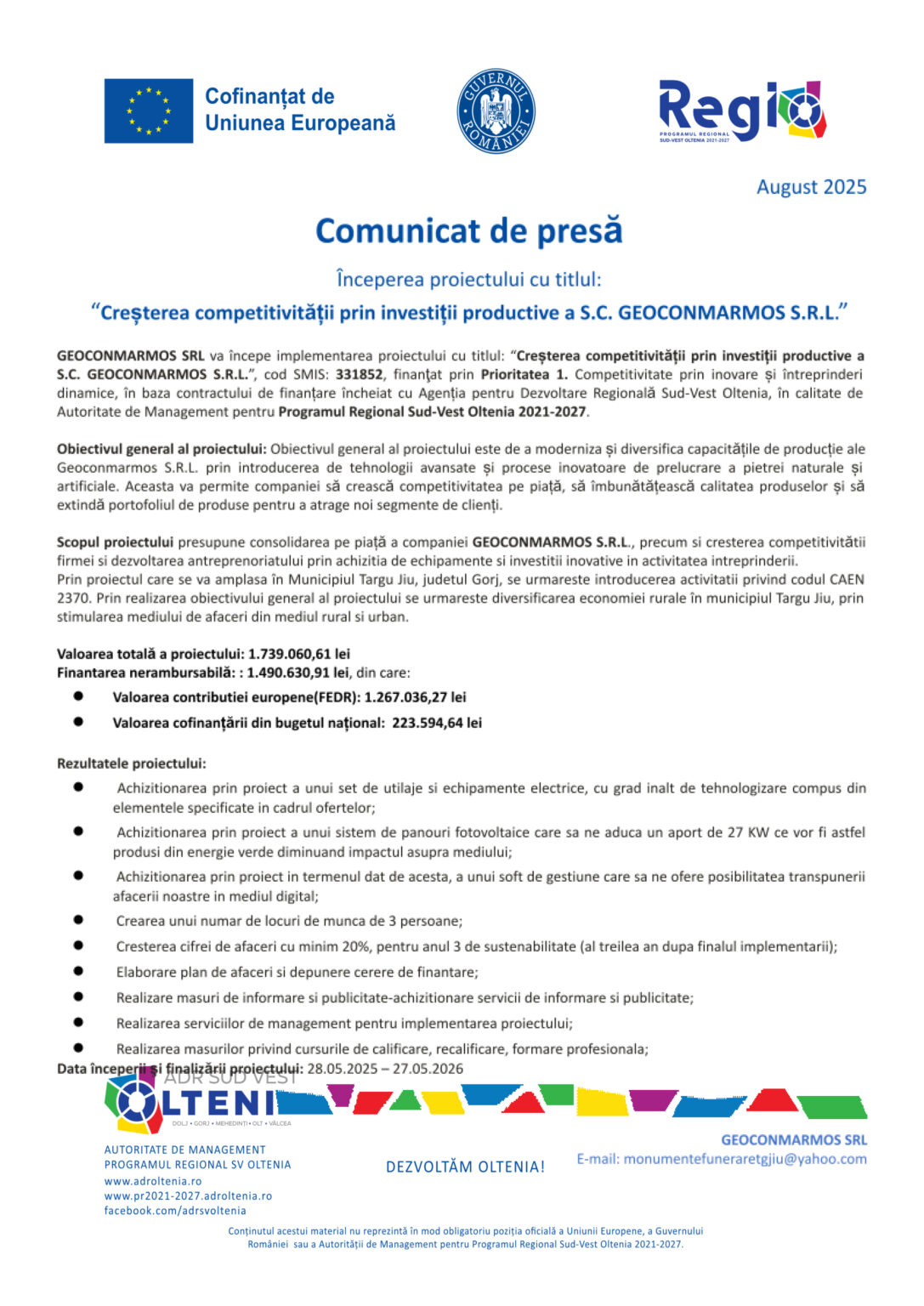 GEOCONMARMOS SRL va începe implementarea proiectului cu titlul: “Creșterea competitivității prin investiții productive a S.C. GEOCONMARMOS S.R.L.”, cod SMIS: 331852, finanţat prin Prioritatea 1. Competitivitate prin inovare și întreprinderi dinamice, în baza contractului de finanțare încheiat cu Agenția pentru Dezvoltare Regională Sud-Vest Oltenia, în calitate de Autoritate de Management pentru Programul Regional Sud-Vest Oltenia 2021-2027.