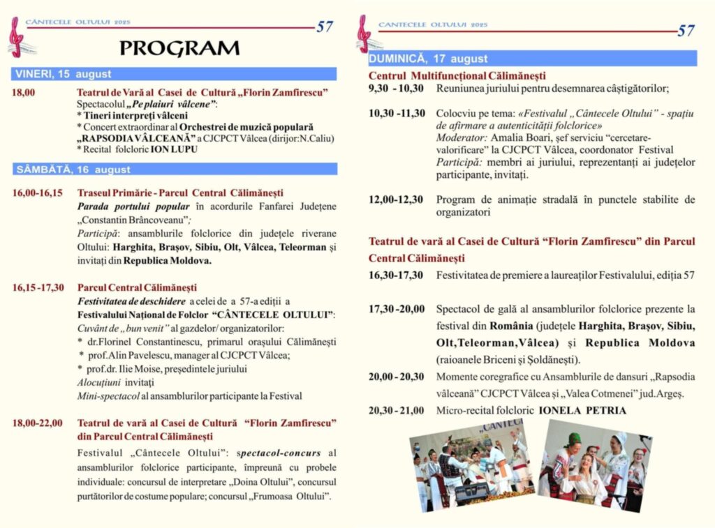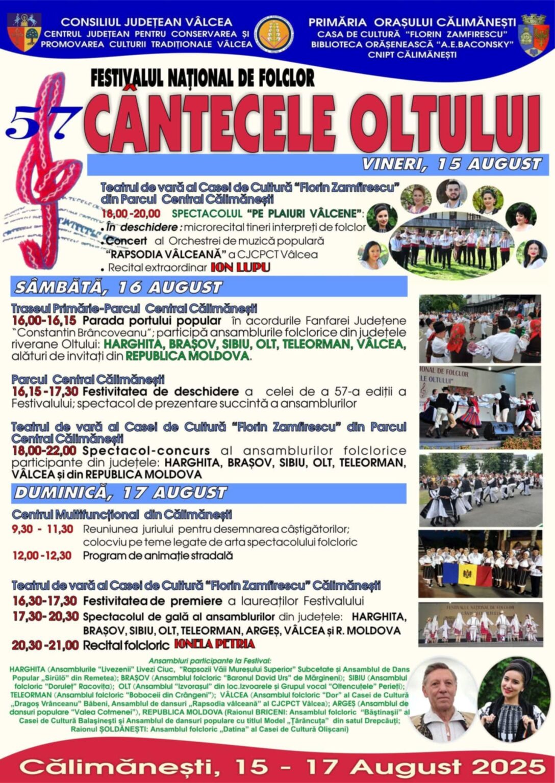 În perioada 15 – 17 august 2025, stațiunea Călimănești se va transforma din nou într-o veritabilă cetate a tradițiilor, găzduind cea de-a 57-a ediție a Festivalului Național de Folclor „Cântecele Oltului”. Evenimentul, organizat de Consiliul Județean Vâlcea, Centrul Județean pentru Conservarea și Promovarea Culturii Tradiționale Vâlcea, Primăria orașului Călimănești și Casa de Cultură „Florin Zamfirescu”, reunește ansambluri folclorice din numeroase județe ale țării, precum și invitați din Republica Moldova.
