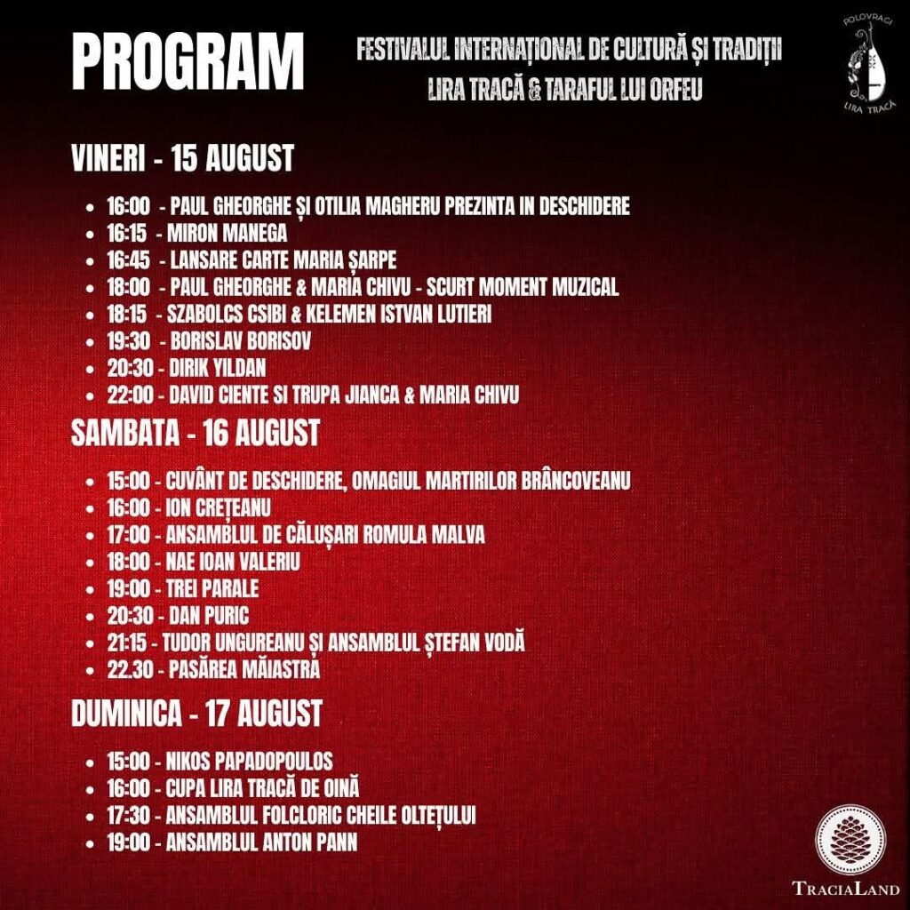 „Lira Tracă și Taraful lui Orfeu” este mai mult decât un festival, fiind și o invitație de a redescoperi farmecul tradițiilor populare și de a celebra identitatea culturală în mijlocul naturii, la Polovragi. Organizat de Asociația Europeană TraciaLand, Festivalul Internațional de Cultură și Tradiții „Lira Tracă și Taraful lui Orfeu” este un proiect finanțat cu sprijinul Ministerului Culturii și susținut de numeroși parteneri dedicați. Printre aceștia se numără producători și operatori de food, precum Lactate Călimani, sucurile naturale Din Eden, berea artizanală Curentu, precum și maestrul gastronom Chef Menumorut.