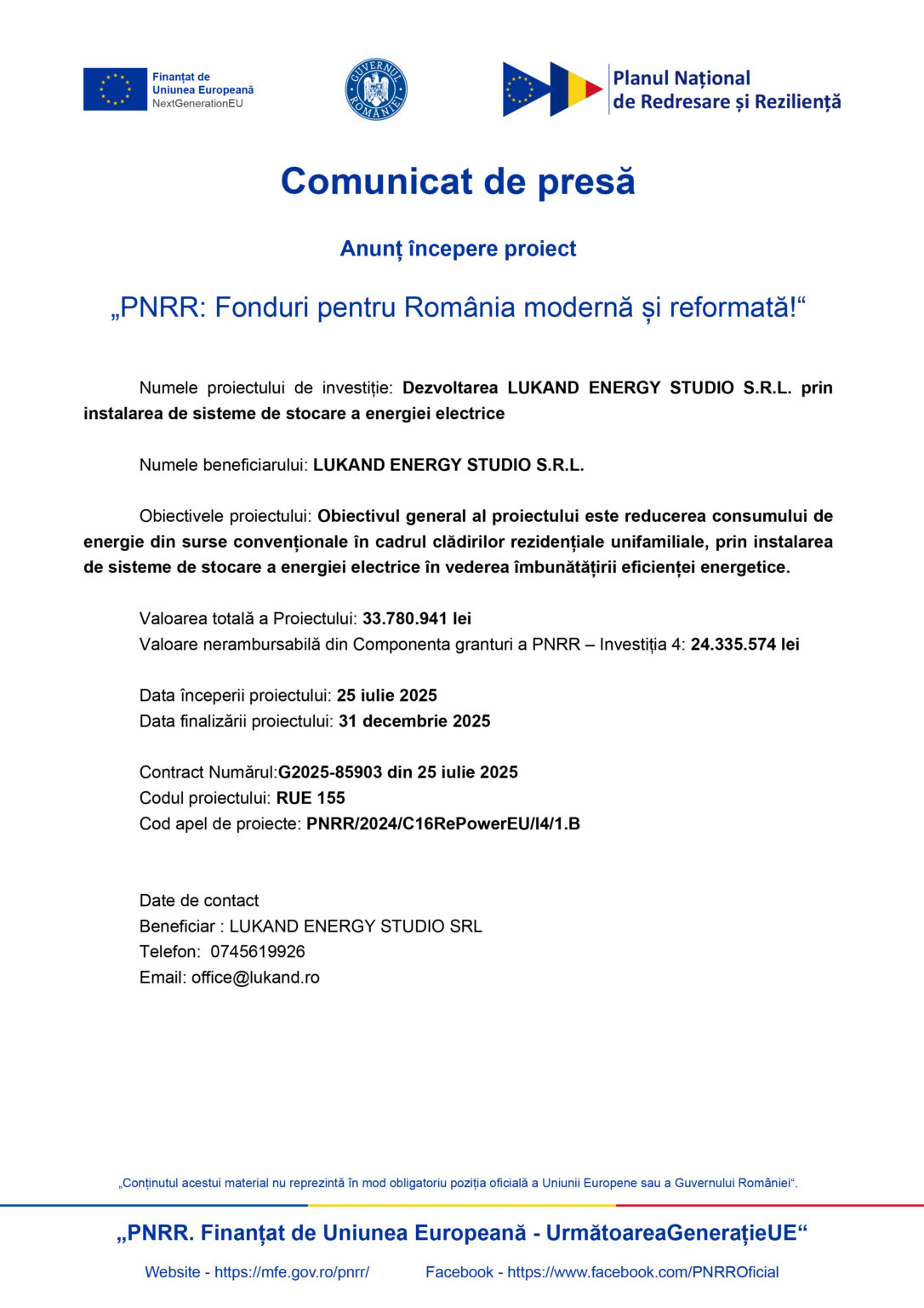 Anunț începere proiect „Dezvoltarea LUKAND ENERGY STUDIO S.R.L. prin instalarea de sisteme de stocare a energiei electrice”